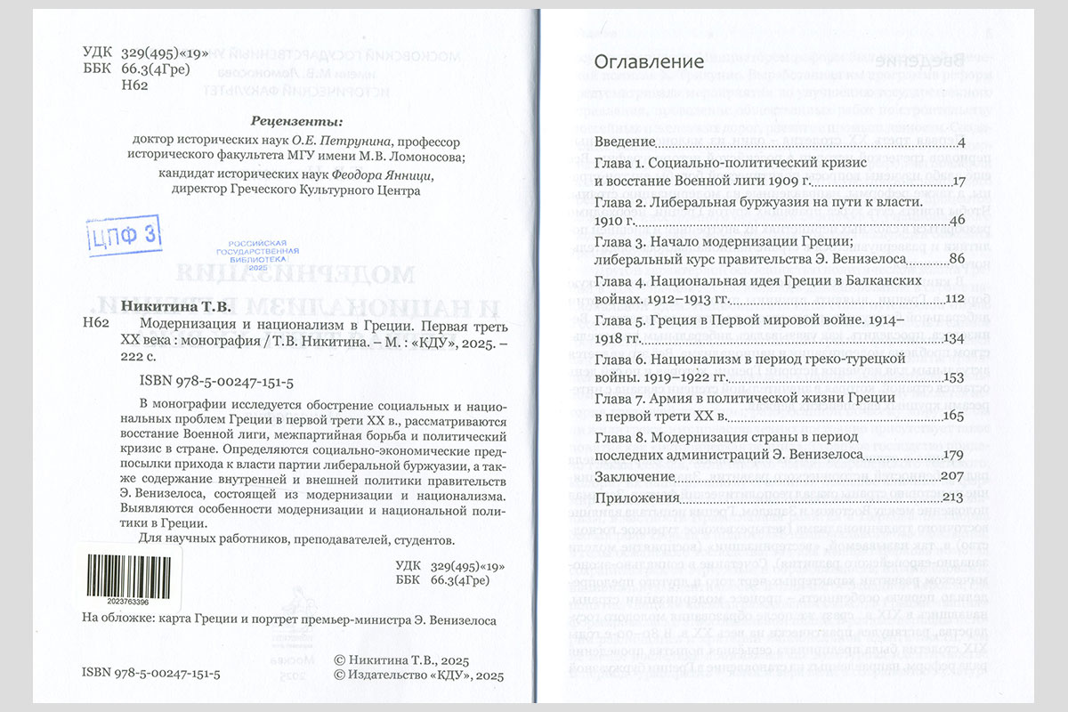 Никитина, Татьяна Васильевна. Модернизация и национализм в Греции. Первая треть XX века. Москва, 2025