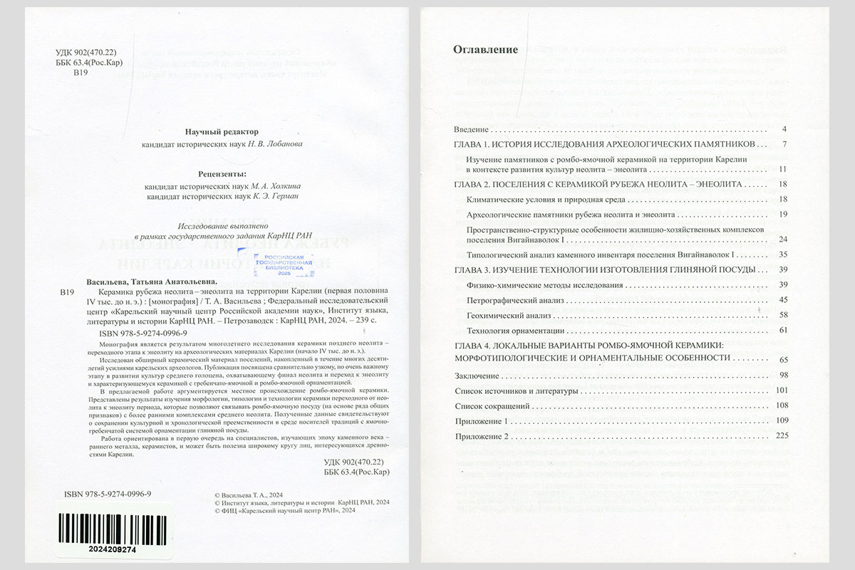 Васильева, Татьяна Анатольевна. Керамика рубежа неолита — энеолита на территории Карелии (первая половина IV тыс. до н. э.). Петрозаводск, 2024