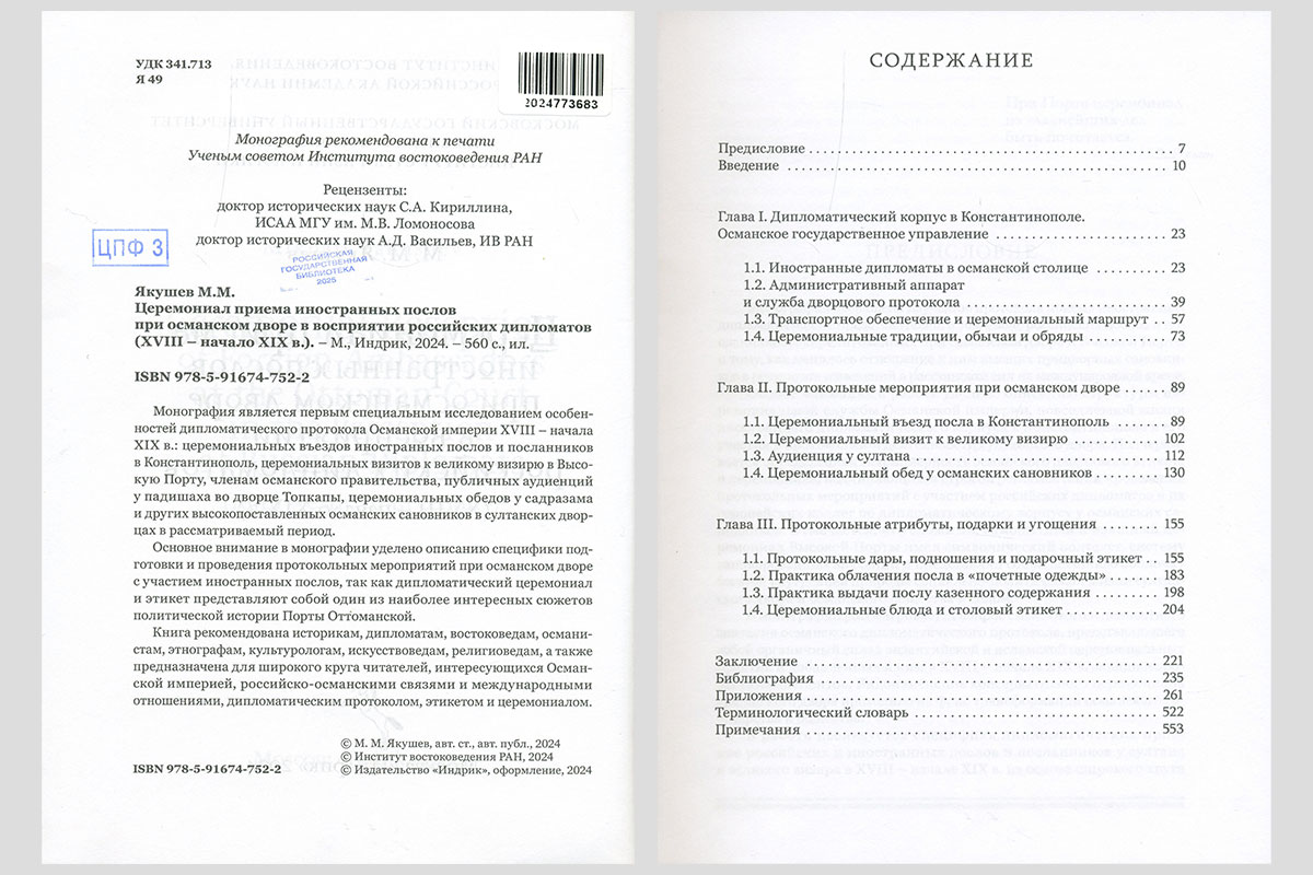 Якушев, Михаил Михайлович. Церемониал приёма иностранных послов при османском дворе в восприятии российских дипломатов (XVIII — начало XIX в.). Москва, 2024