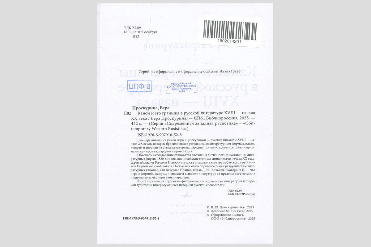 Проскурина, Вера Ю. Канон и его границы в русской литературе XVIII — начала XX века. Санкт-Петербург, 2025
