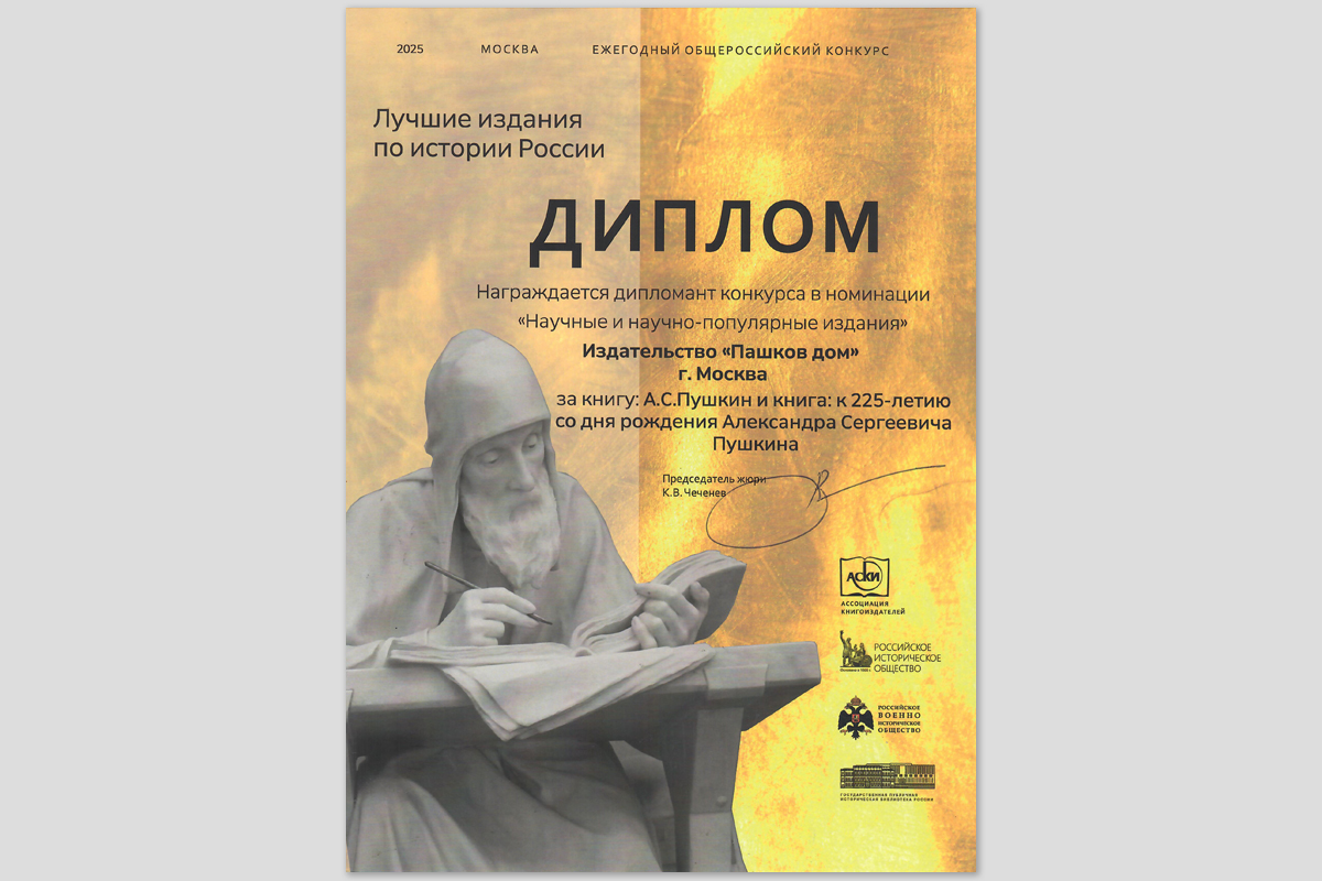 Иллюстрированный сборник «А. С. Пушкин и книга» был отмечен дипломом на общероссийском конкурсе «Лучшие издания по истории России». Церемония награждения состоялась 12 ноября 2025 года в Музее военной формы Российского военно-исторического общества.