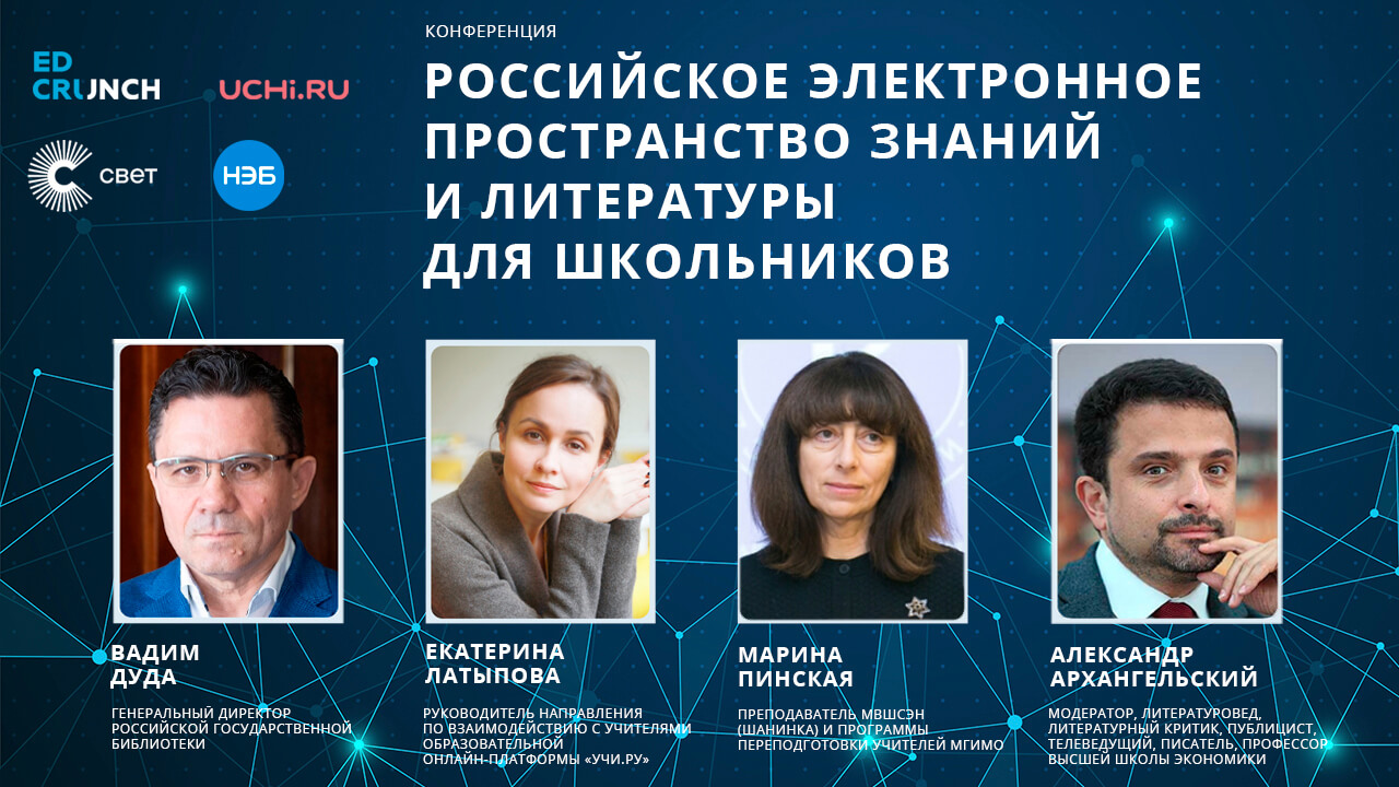 10 декабря в 12:20 на площадке EdCrunch начнётся конференция о развитии читательской грамотности, тенденциях и влиянии дистанционного образования, роли цифровых помощников и приложений в образовании «Российское электронное пространство знаний и литературы для школьников» . Конференция пройдёт в онлайн-формате.