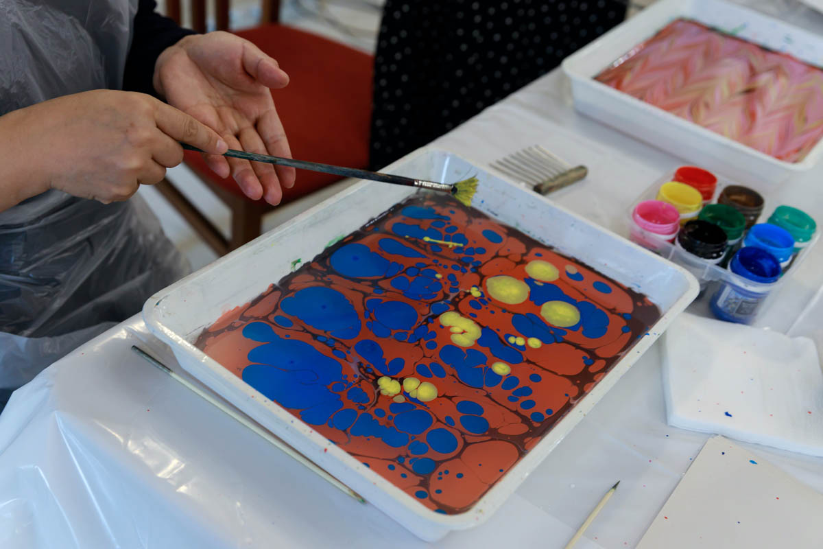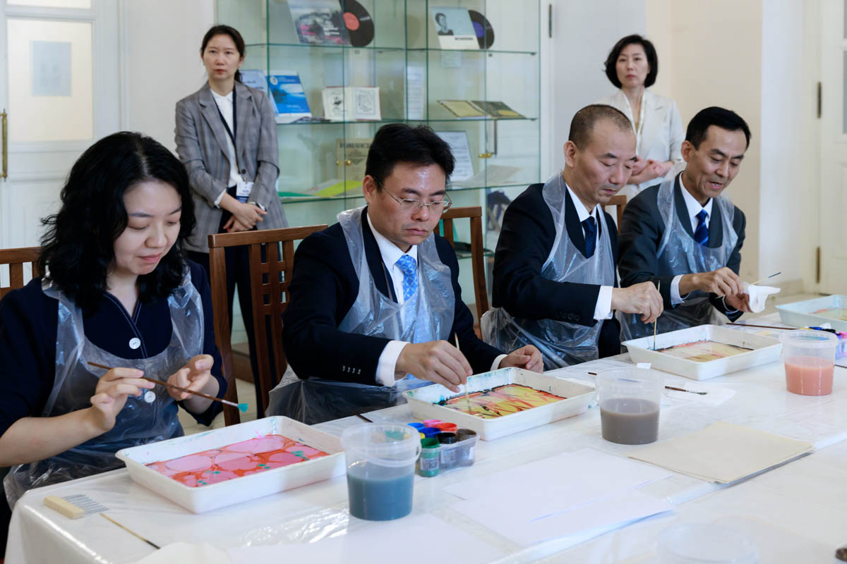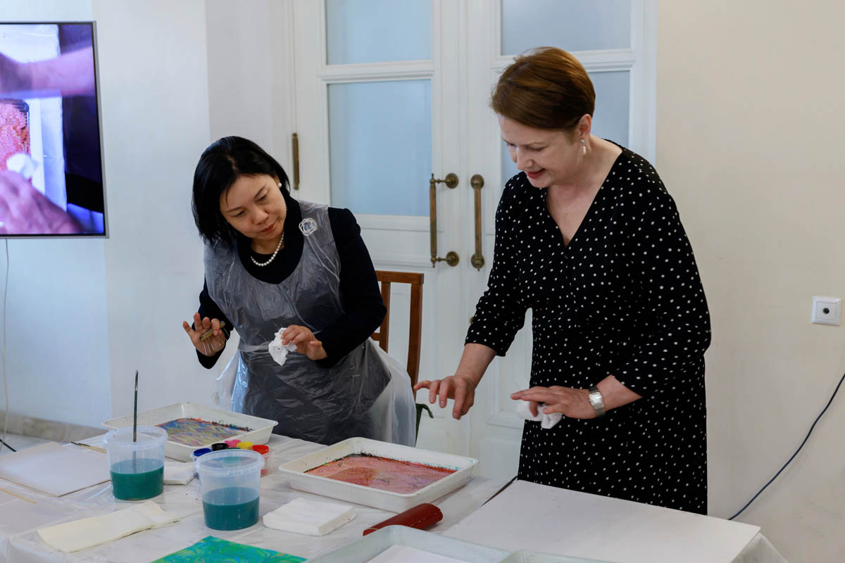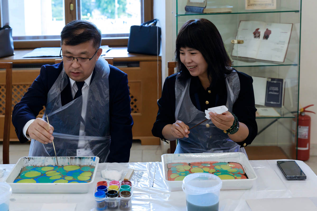 Уникальным опытом для участников III Российско-Китайского библиотечного форума стали профессиональные мастер-классы по мраморированию бумаги и гектографии, которые провели сертифицированный эксперт по мраморной бумаге Елена Белозерова и художник-реставратор 3-й категории отдела реставрации библиотечных фондов РГБ Дарья Полейчук.