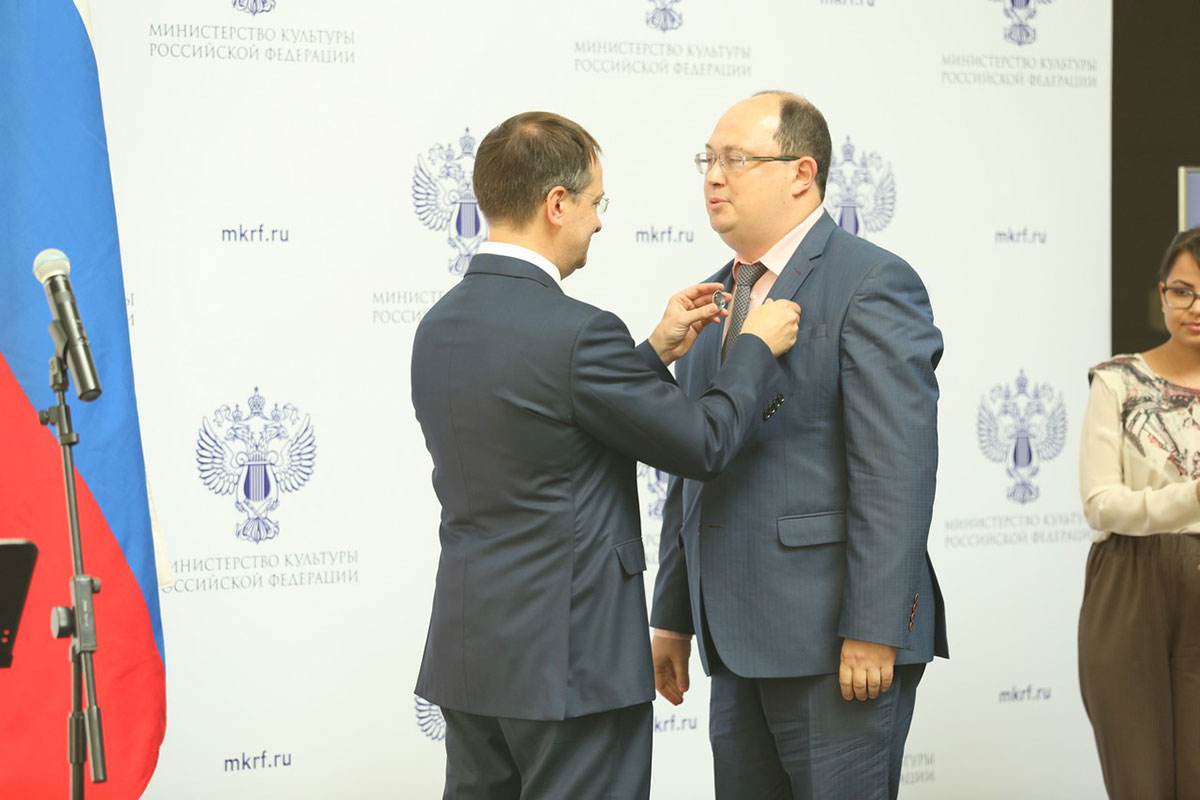 Министр культуры Российской Федерации Владимир Мединский вручает награду заместителю генерального директора РГБ по научно-издательской деятельности Александру Самарину . Фото с сайта mkrf.ru