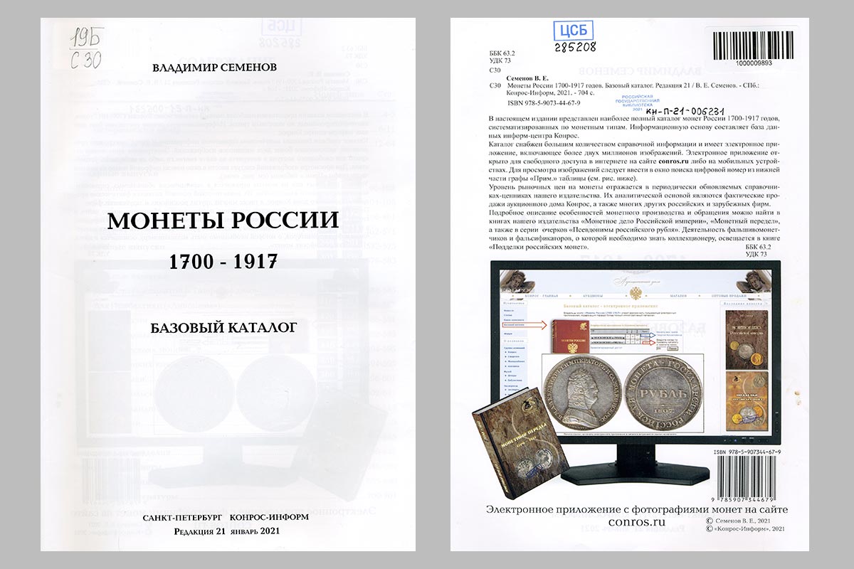 Семенов, Владимир Евгеньевич. Монеты России 1700—1917: базовый каталог: редакция 21. Санкт-Петербург, 2021.