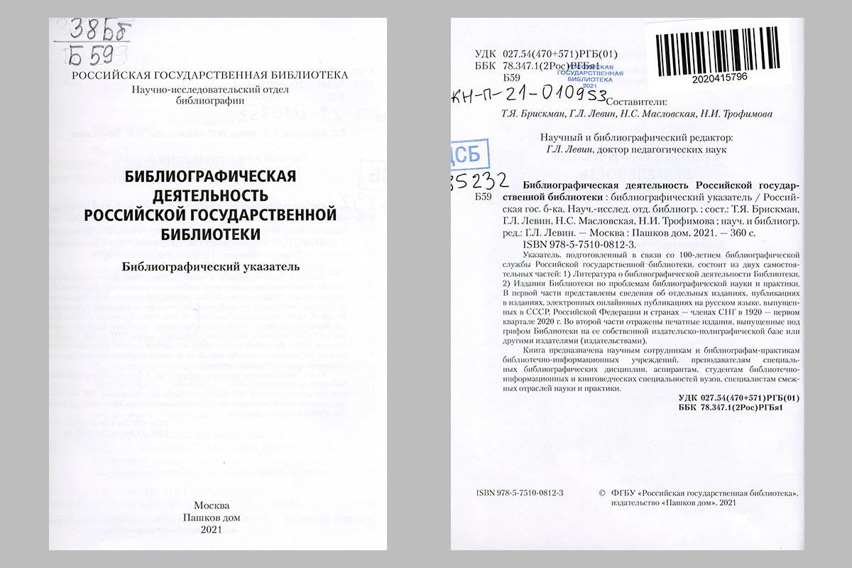 Библиографическая деятельность Российской государственной библиотеки: библиографический указатель. Москва, 2021.