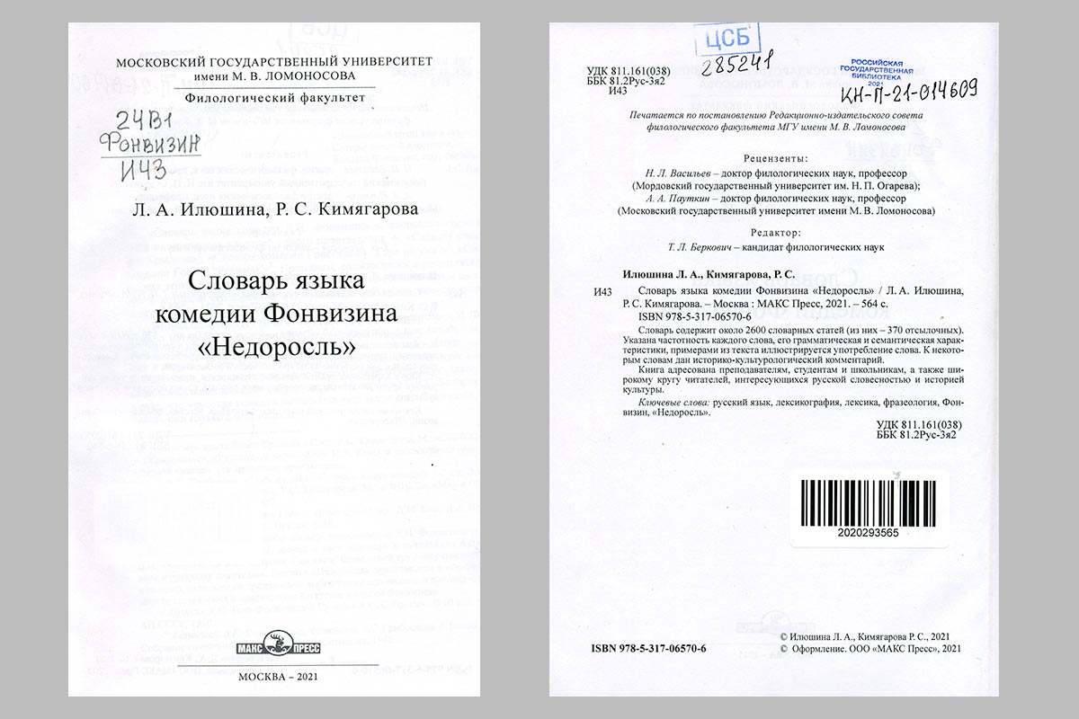 Илюшина, Людмила Алексеевна. Словарь языка комедии Фонвизина «Недоросль». Москва, 2021.