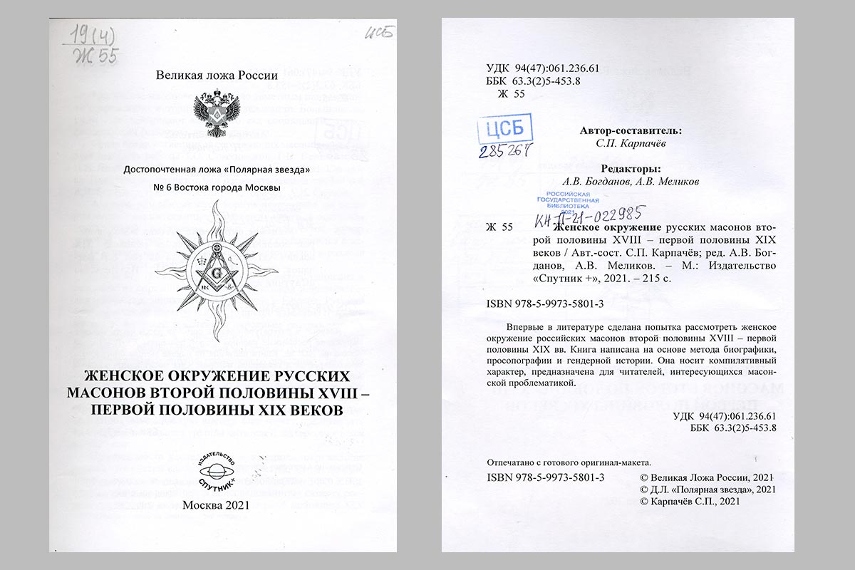 Женское окружение русских масонов второй половины XVIII — первой половины XIX веков: Великая ложа России, Достопочтенная ложа «Полярная звезда» № 6 Востока города Москва. Москва, 2021.