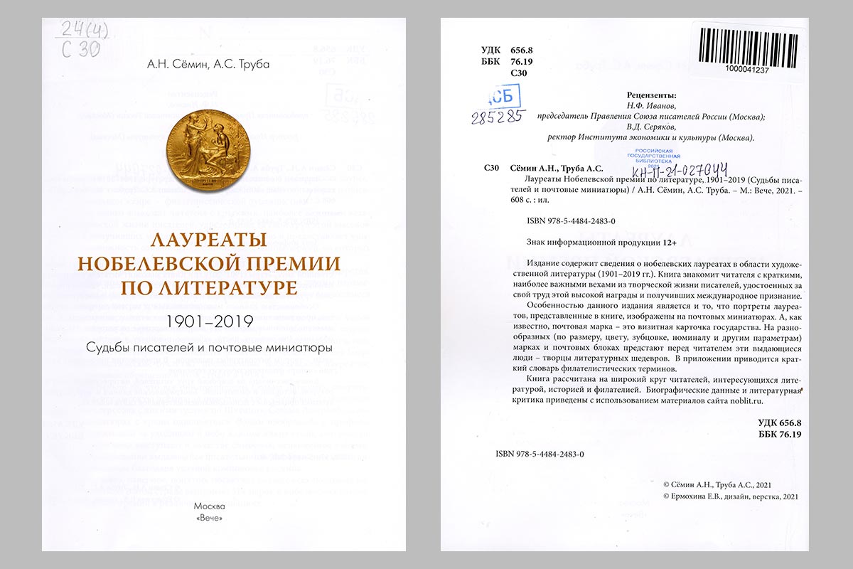 Сёмин, Александр Николаевич. Лауреаты Нобелевской премии по литературе. 1901—2019: судьбы писателей и почтовые миниатюры. Москва, cop. 2021.