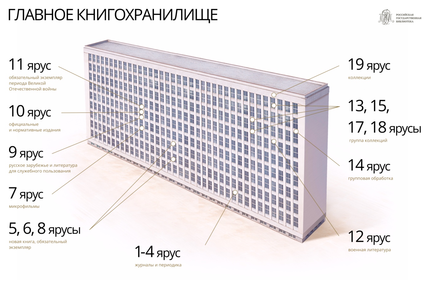 Это был только первый взгляд с высоты девятнадцати ярусов. В течение всего года мы будем спускаться ниже и подниматься выше, открывать двери в отделы и рассказывать истории людей, благодаря которым любая книга, заказанная вами, совершает точное путешествие из глубины фонда к вам в руки.