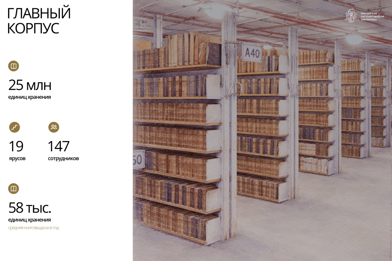 - Если мысленно вытянуть все полки основного фонда в одну линию — её длина составит 300 километров. Это три круга по Московской кольцевой автодороге.