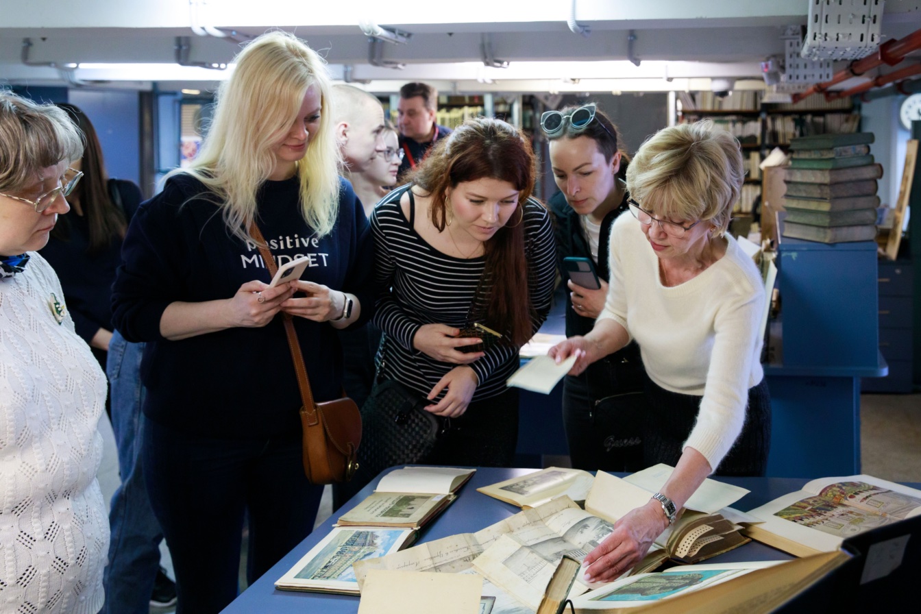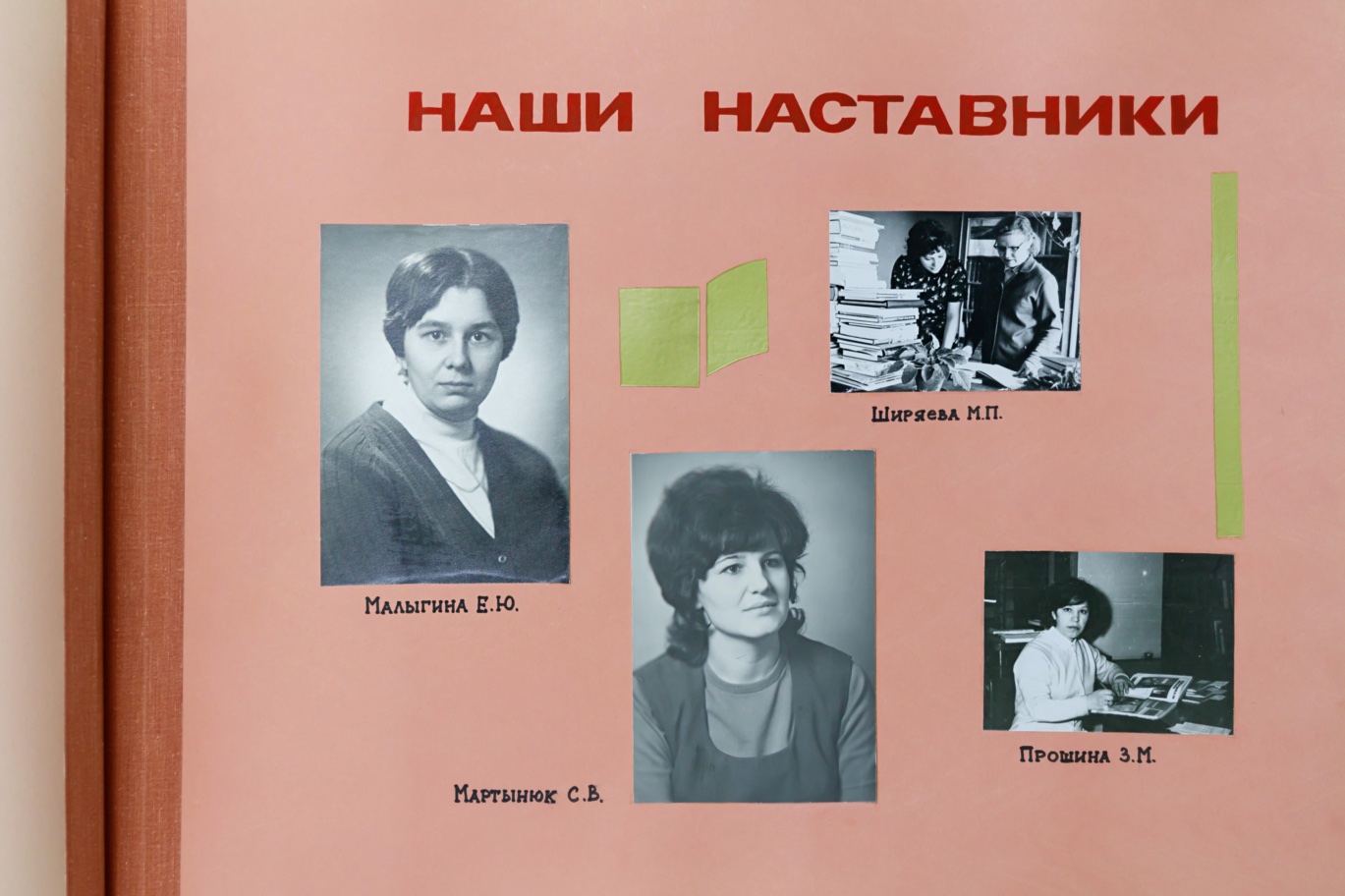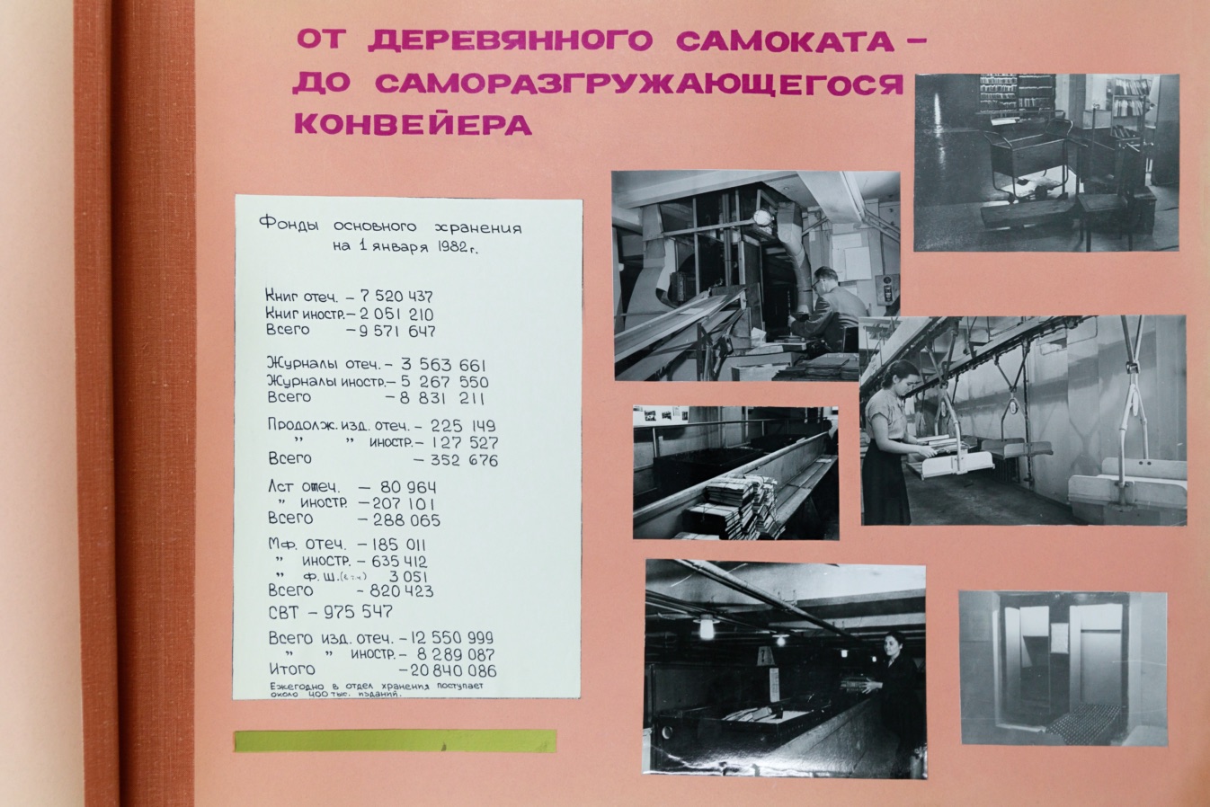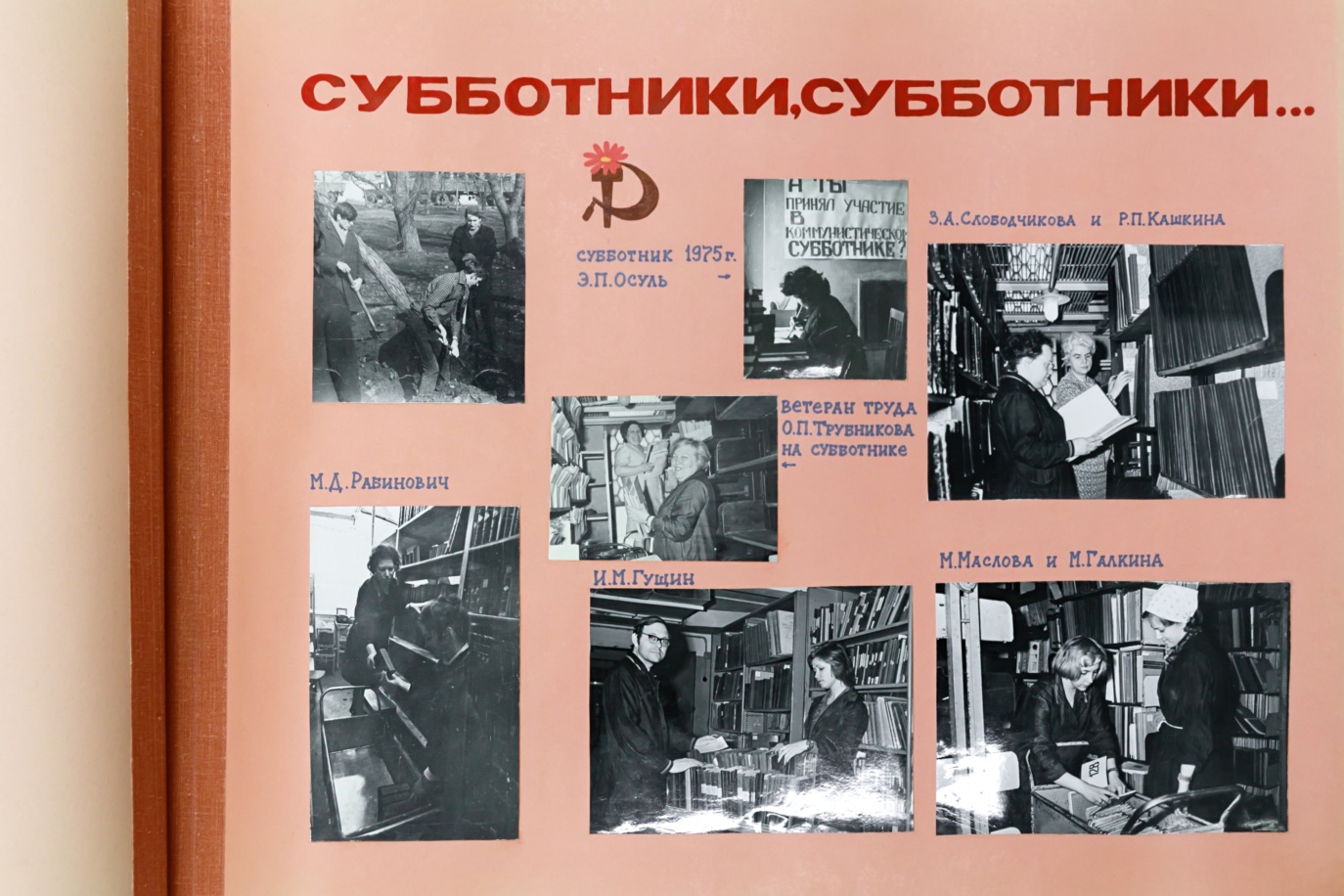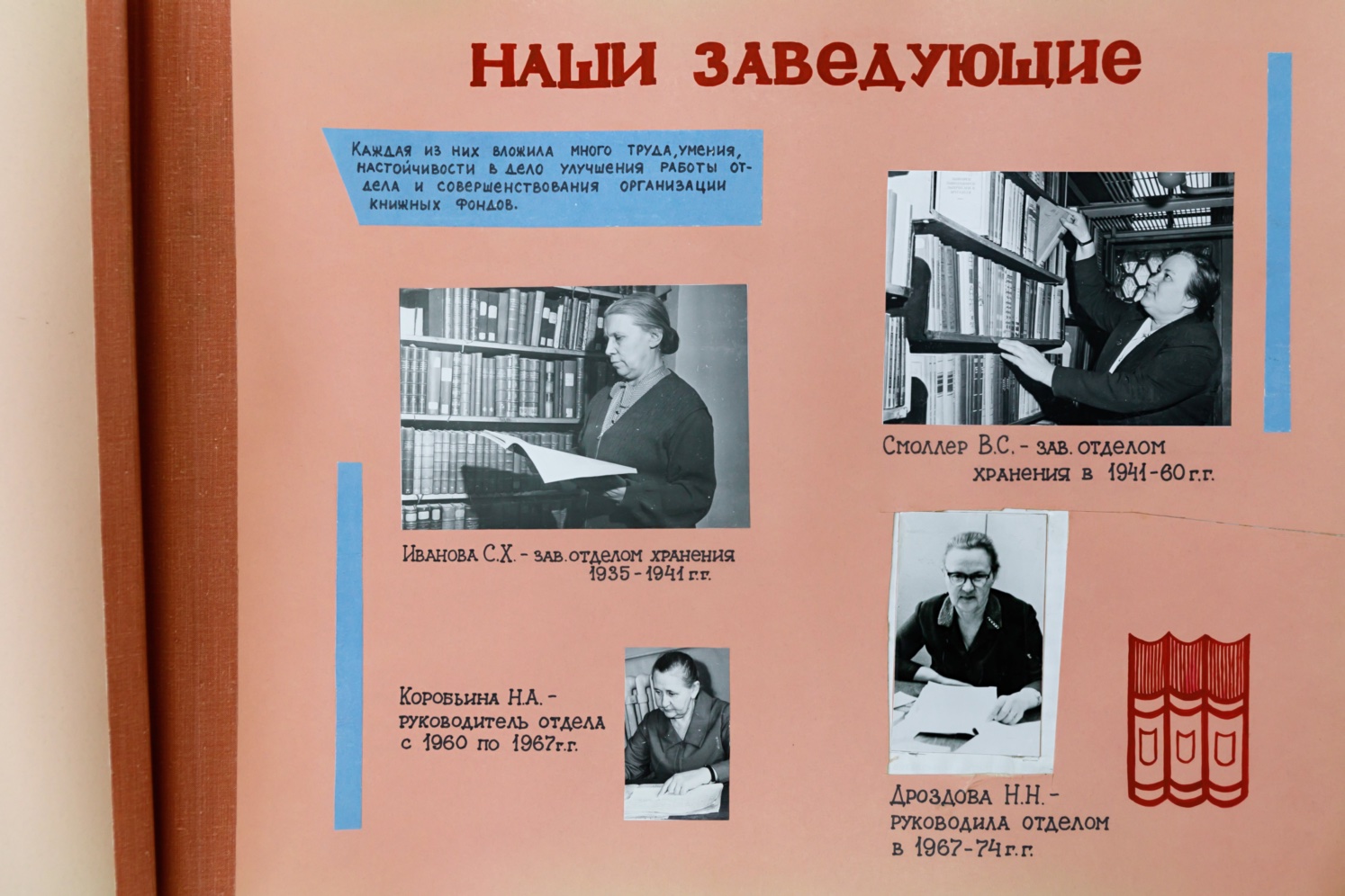 Листая эти страницы, видишь не только историю, но и лица. Вот портреты заведующих, которые руководили фондом в разные годы. Вот фотографии с субботников — сотрудники с тележками, стремянками, в рабочих халатах. Снимки конвейеров, по которым когда-то перемещались книги, и в те времена это была самая передовая механизация. Вот ветераны труда, которых помнят до сих пор: некоторые нынешние хранители начинали свой путь под их руководством. На отдельных страницах — наставники, которые передавали свой опыт молодым.