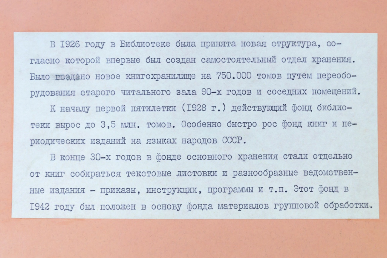 Отдел основного фонда был создан в Ленинской библиотеке в 1926 году. В нём тогда находилось несколько миллионов изданий, и более точная цифра неизвестна. В те годы было не до скрупулёзных статистических подсчётов, страна только приходила в себя, книжные собрания нужно было спасти, сохранить, описать. Для нового книгохранилища переоборудовали часть Дома Пашкова — старый читальный зал 1890-х годов и соседние с ним помещения. Там предполагалось разместить 750 тысяч томов.