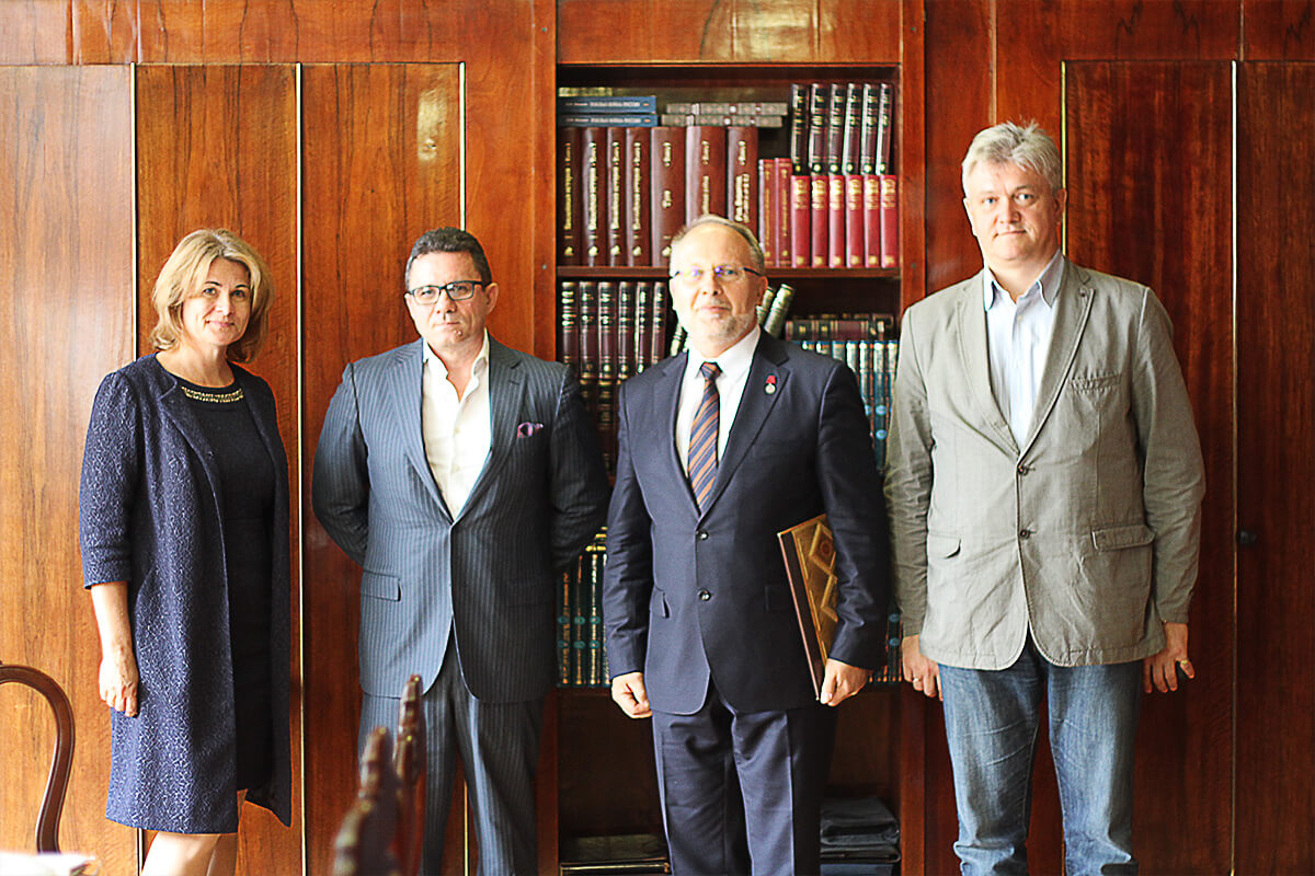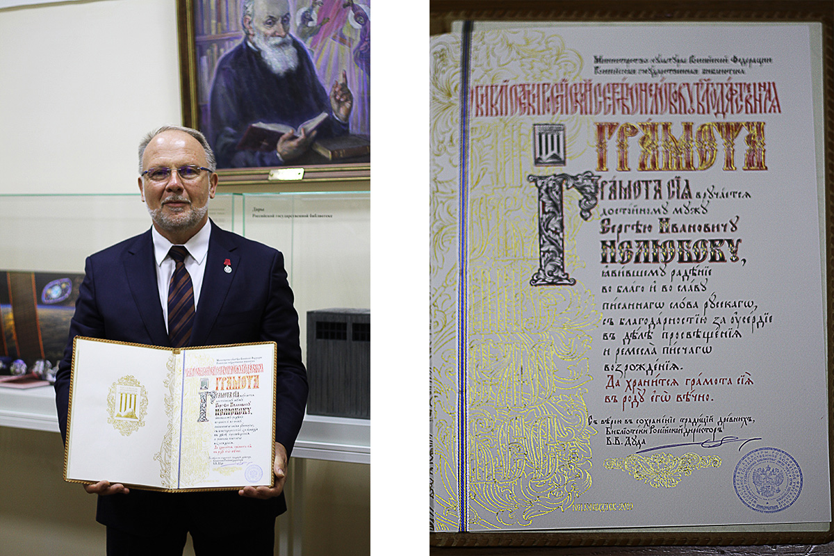 Генеральный директор Российской государственной библиотеки Вадим Дуда вручил почётную грамоту создателю и директору Музея русского быта «Вотчина», председателю Калужского общества коллекционеров Сергею Нелюбову за участие в семинаре «Реставрация документа: консерватизм и инновации» и организацию выставки «Рисование словес».