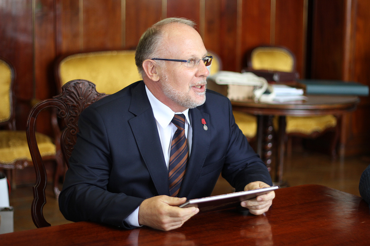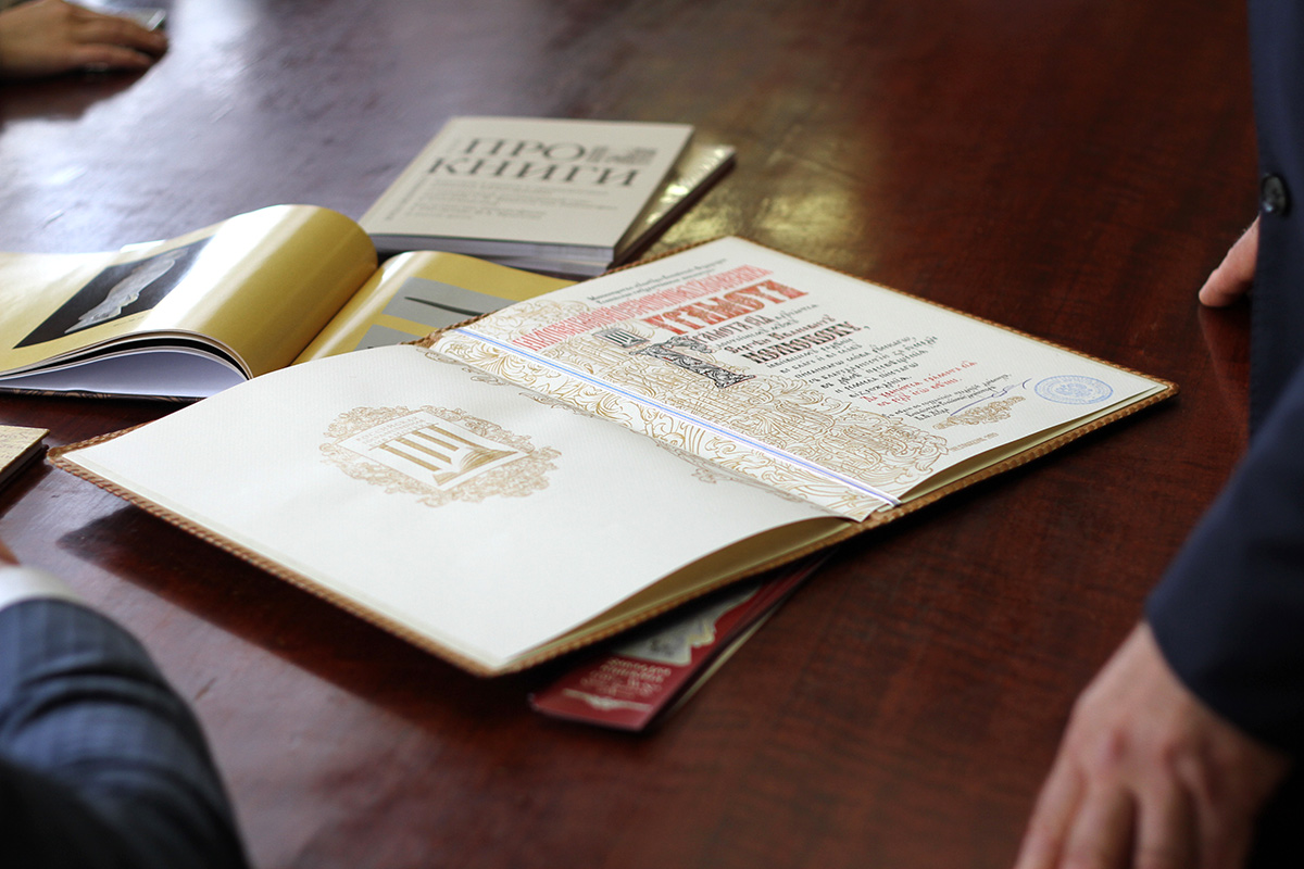 В благодарность за сотрудничество Вадим Дуда вручил Сергею Нелюбову рукописную грамоту, выполненную руководителем Школы исторической каллиграфии Юрием Ковердяевым.