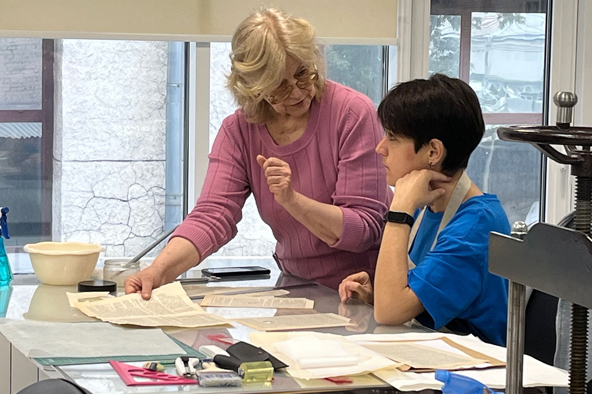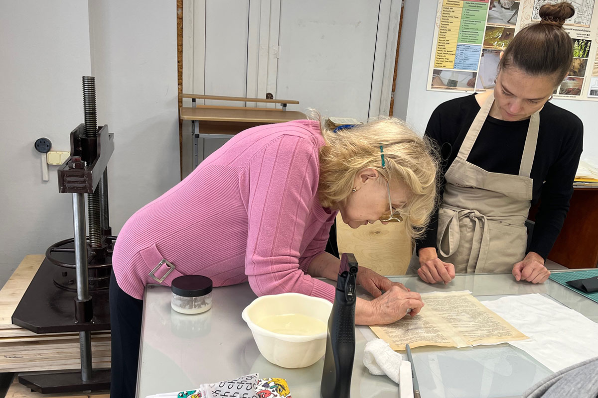 Коллеги ознакомились с процессами реставрации листа и реставрационными материалами. Научились оценивать состояние сохранности документа и готовить его к реставрации. Активно практиковались в реставрации газет, карт и других листовых документов.