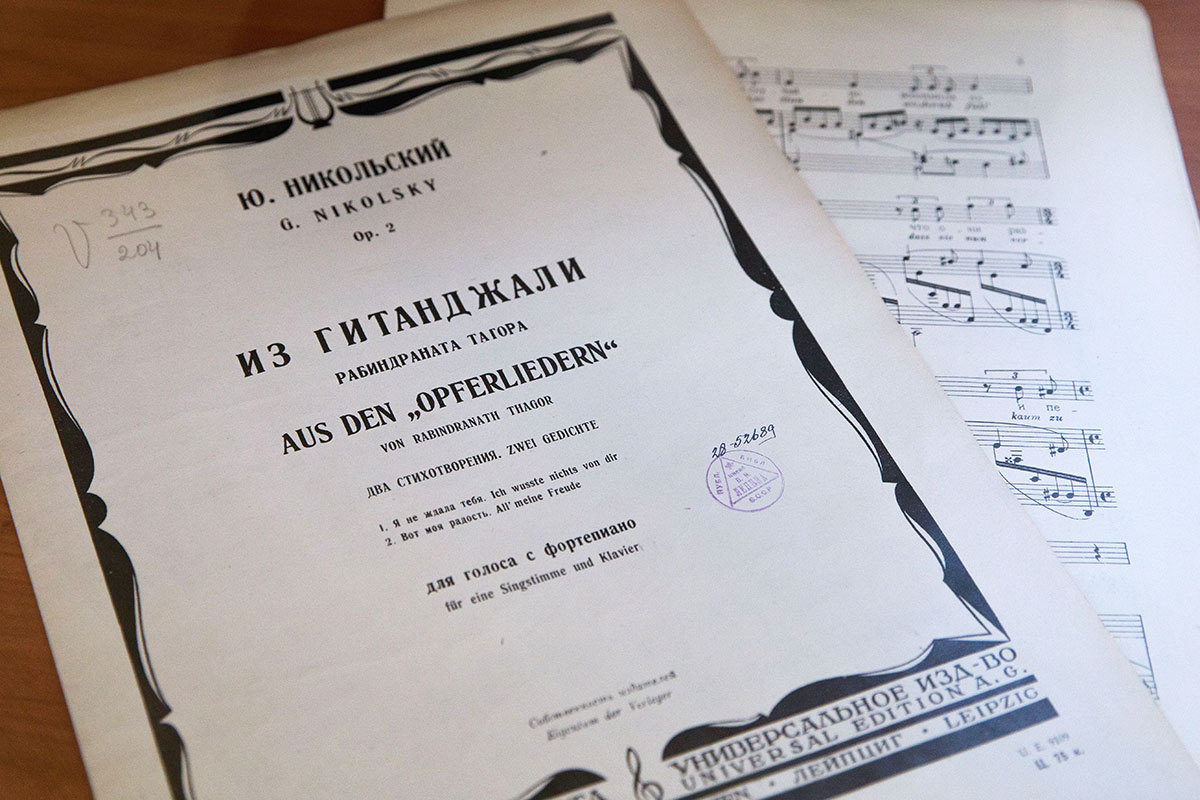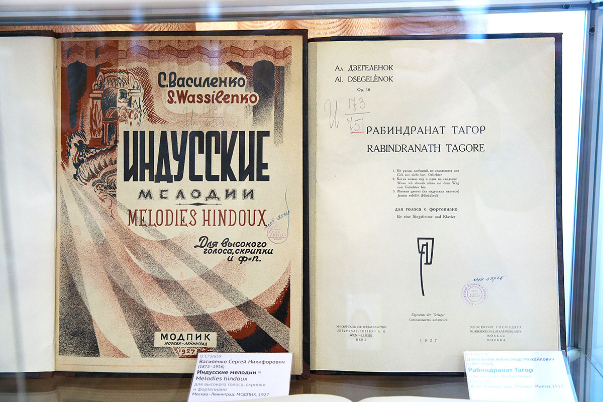 Отдельная часть выставки — нотные издания и грампластинки. Стихи и песни Рабиндраната Тагора вдохновляли многих композиторов и музыкантов. Записи нот и песен, исполненные европейскими композиторами ХХ века на основе его произведений хранятся в фонде отдела нотных изданий и звукозаписей РГБ. На выставке представлены ноты старейшего российского музыкального издательства «Юргенсон», лейпцигского Universal edition, грампластинки Апрелевского завода.