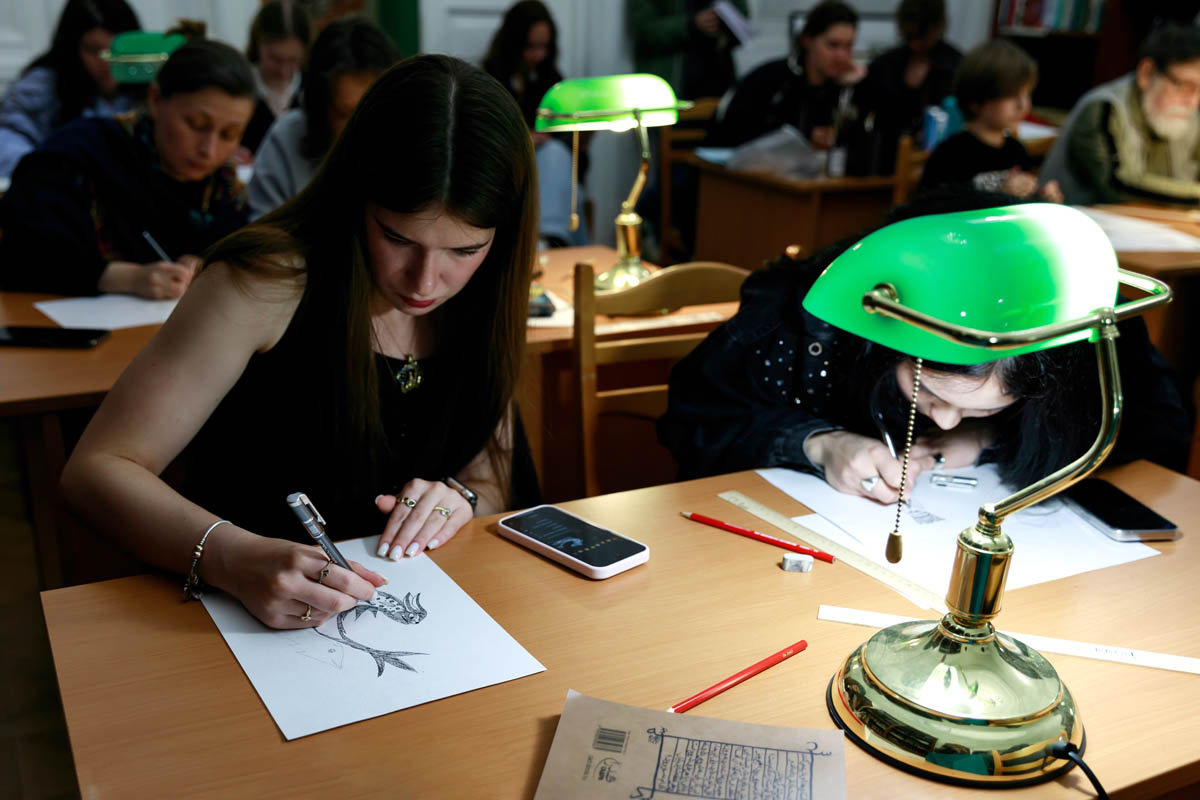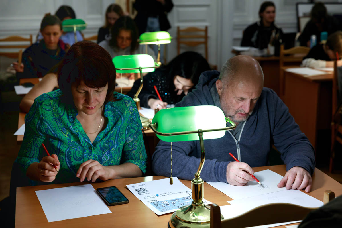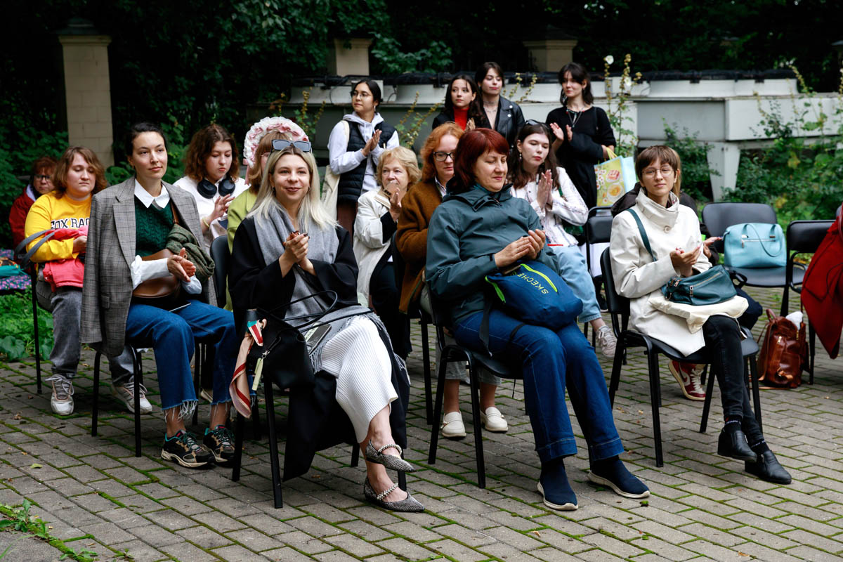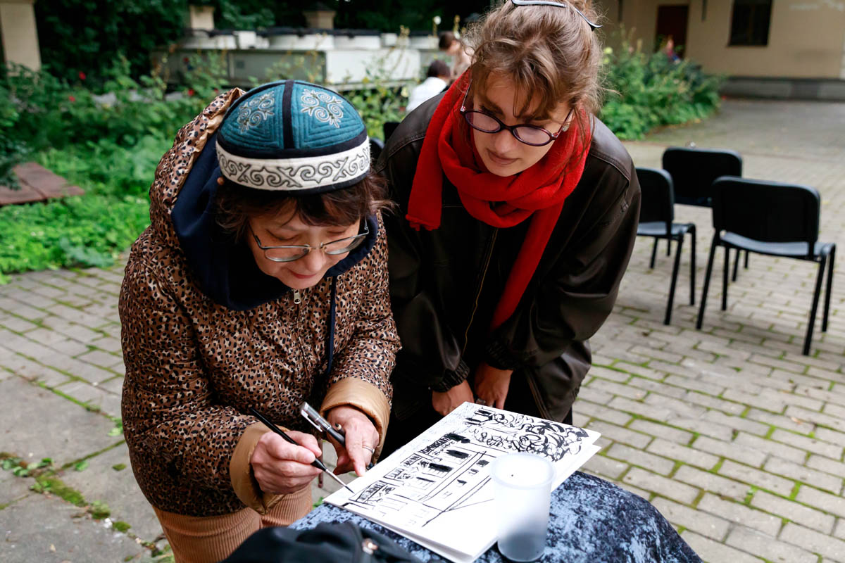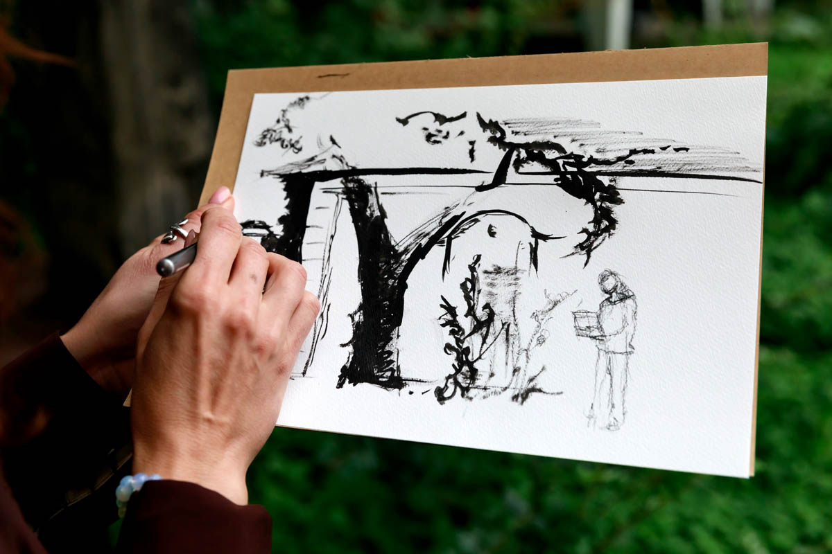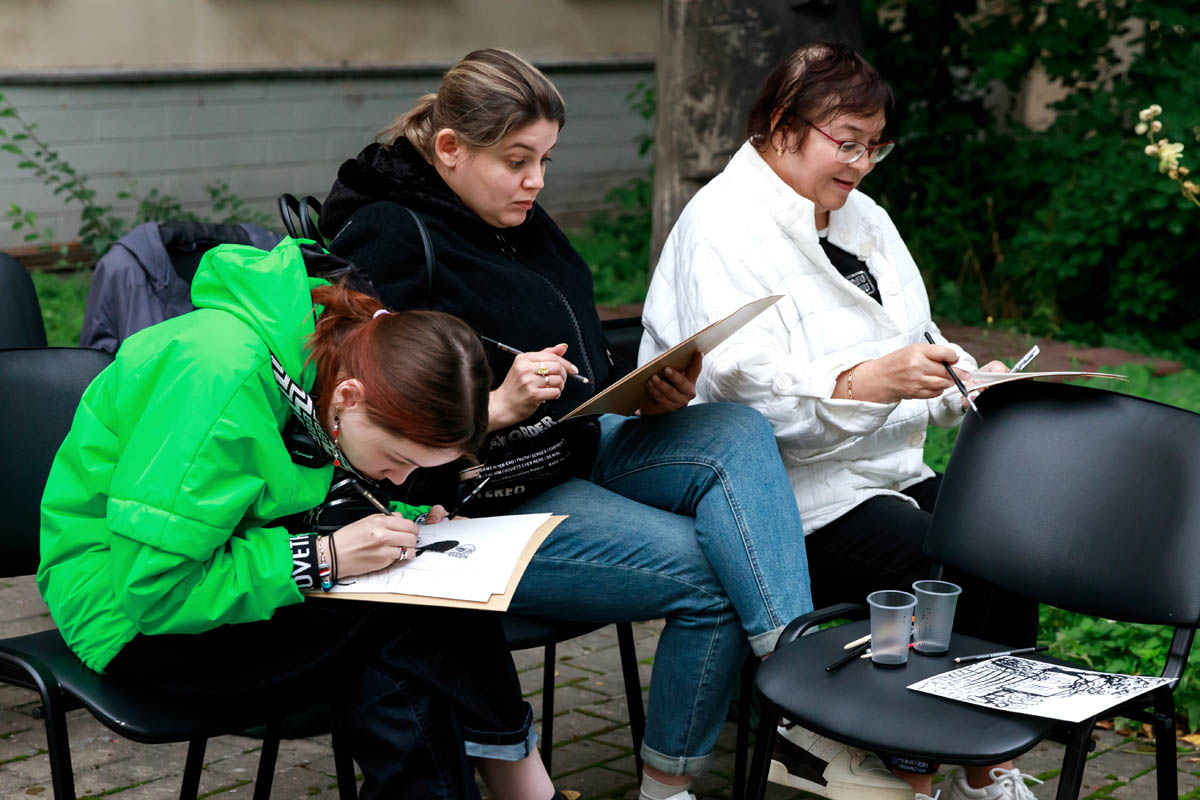 Художница Диана Некрасова провела занятие по скетчингу на открытом воздухе — его участники изображали экстерьеры здания и фигуры людей. Для многих