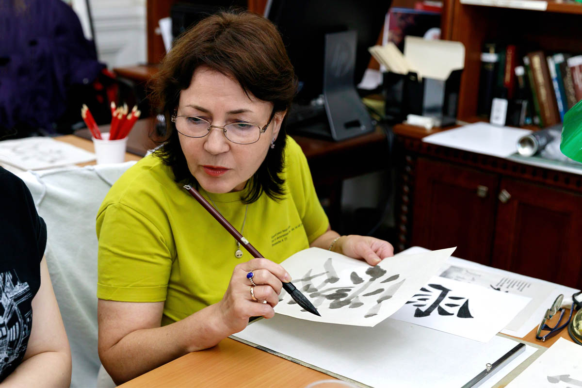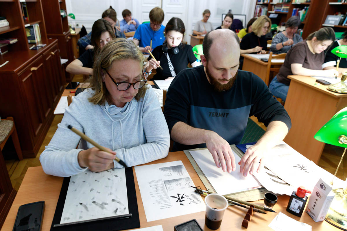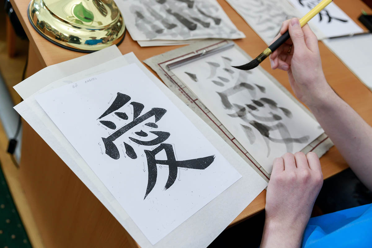 На занятии по китайской каллиграфии гости осваивали написание иероглифа «Любовь» на рисовой бумаге, знакомясь с эстетикой и философией древнего искусства.