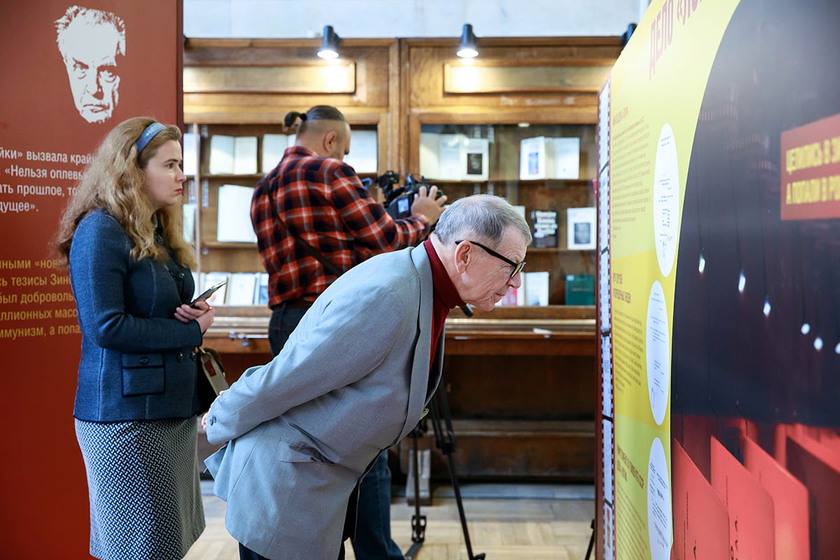 На открытии выставки об Александре Зиновьеве говорили генеральный директор РГБ Вадим Дуда и президент Биографического института Александра Зиновьева, жена, соратник и хранитель его творческого и интеллектуального наследия Ольга Зиновьева.