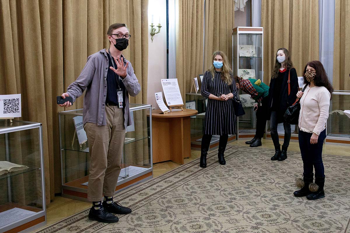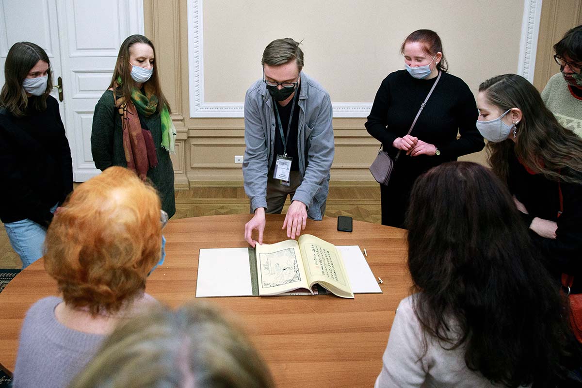 Кураторы выставки Ольга Ижбулатова и Даниил Огнев провели несколько интереснейших экскурсий. Они познакомили посетителей с лучшими книгами из фондов ЦВЛ, вошедшими в проект «Книжные памятники», рассказали об истории книжного искусства на Ближнем и Дальнем Востоке, о взаимовлиянии Европы и Азии в процессе развития книгопечатания, о том, почему в Китае не связывают начало книгопечатания с именем Гутенберга, а в мусульманских странах первой изданной книгой был не Коран.