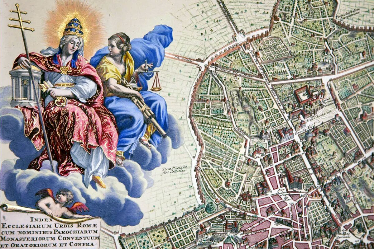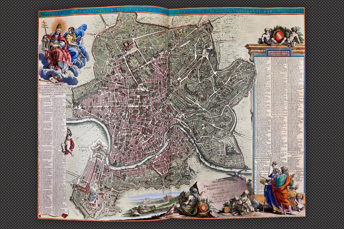 Королевский атлас Августа II Сильного. Том 7. Карта Рима, фрагмент. (Athlas [sic] Royal composé de cartes choisies et originales... Achevé à Amsterdam, 1708—1710). Фото: Мария Говтвань, РГБ