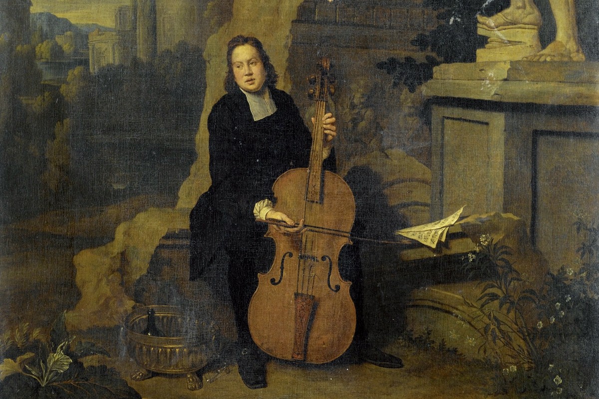 Музыкант, играющий на виолончели, в пейзаже с классической статуей и руинами (A Musician Playing the Violoncello in a Landscape with Classical Statuary and Ruins). Ян Йозеф Хореманс Старший (1682—1759, Антверпен)