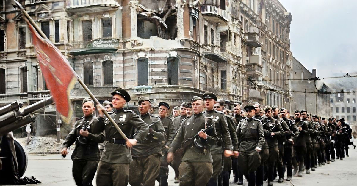 Колонна советских воинов марширует по берлинским улицам. 1945