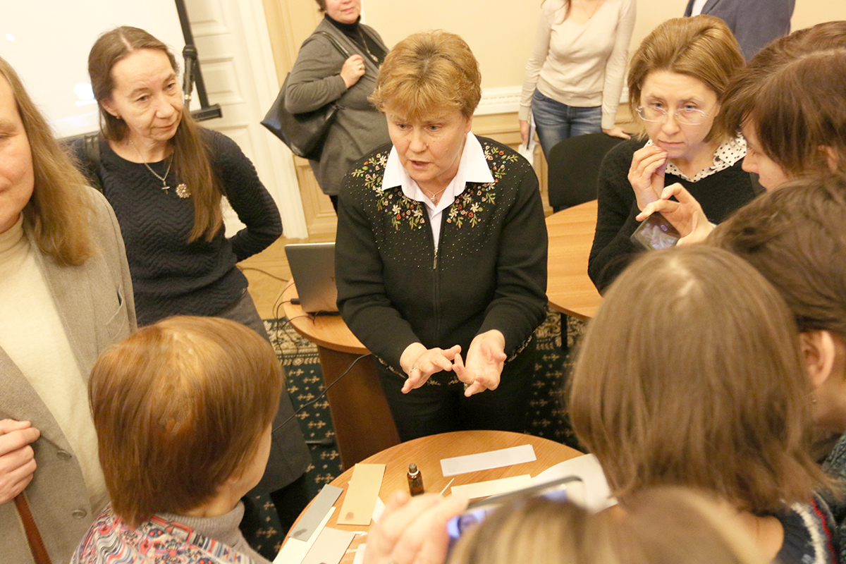 В ходе дискуссии были обозначены основные требования к современным материалам для фазовой консервации. Эксперты продемонстрировали присутствующим способы измерения основных показателей и влияние их предельных значений на сохраняемые документы. Заместитель начальника лаборатории микрофильмирования и реставрации документов Российского государственного архива научно-технической документации Ирина Сергеевна Шарапова провела практическое занятие по использованию экспресс-метода определения качества бумаги и картона. Участники круглого стола под её руководством увлеченно выявляли следы лигнина в образцах картона и бумаги.