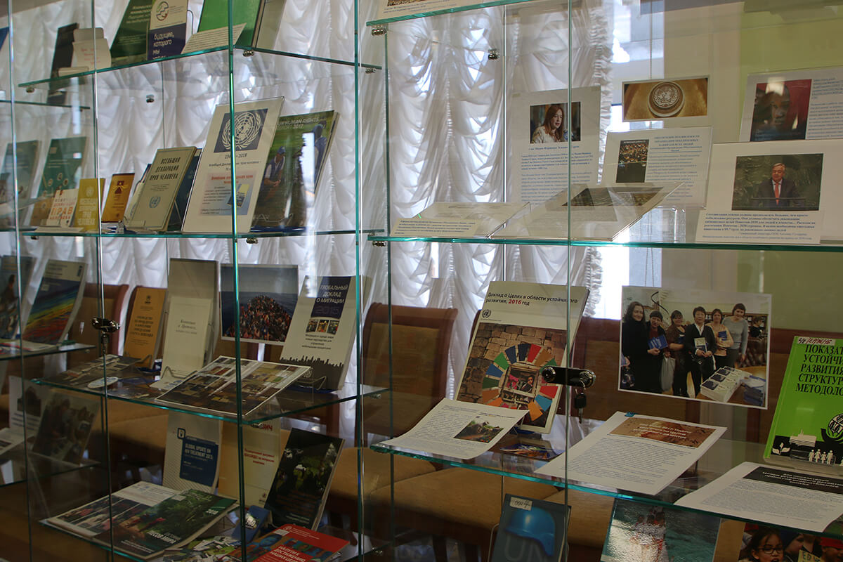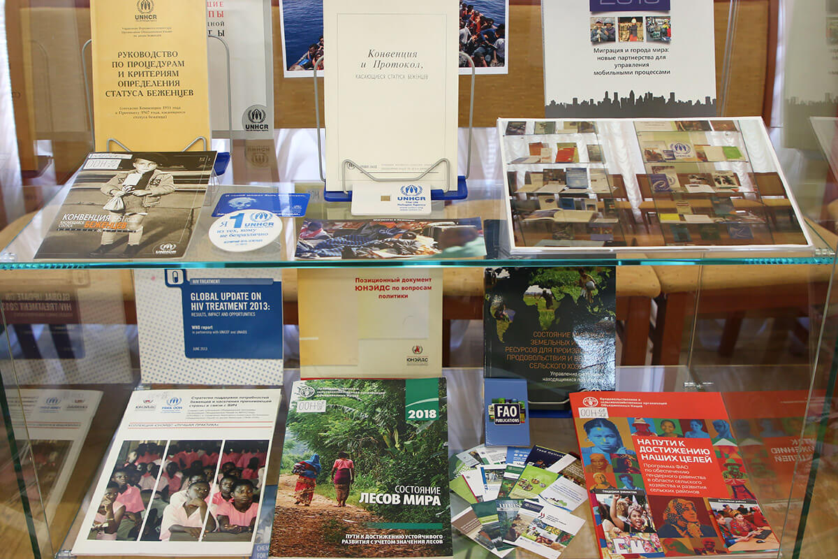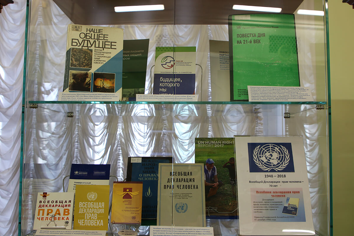 В экспозиции представлены документы и публикации специализированных учреждений системы ООН: Специализированного учреждения ООН по вопросам образования, науки и культуры (ЮНЕСКО), Продовольственной и сельскохозяйственной организации ООН (ФАО), Всемирной организации здравоохранения (ВОЗ) и других. Все издания нацелены на реализацию ЦУР в различных сферах человеческой деятельности. Акцент сделан на Всеобщей декларации прав человека. 10 декабря 2018 года ей исполняется 70 лет. На выставке — целый ряд изданий Декларации, в том числе и самое «старшее», которое датируется 1949 годом.