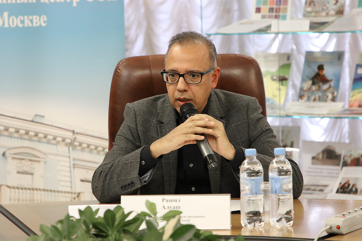 С приветствием к собравшимся обратился директор Информцентра ООН в Москве Владимир Валерьевич Кузнецов. С докладами выступили ответственный за Программу управления Верховного комиссара ООН по правам человека в России Рашид Алуаш, пресс-атташе Отделения ФАО для связи с Россией Владимир Викторович Михеев, заведующая лабораторией геоэкологии и устойчивого природопользования Кафедры международных комплексных проблем природопользования и экологии МГИМО Наталья Евгеньевна Рязанова и другие.