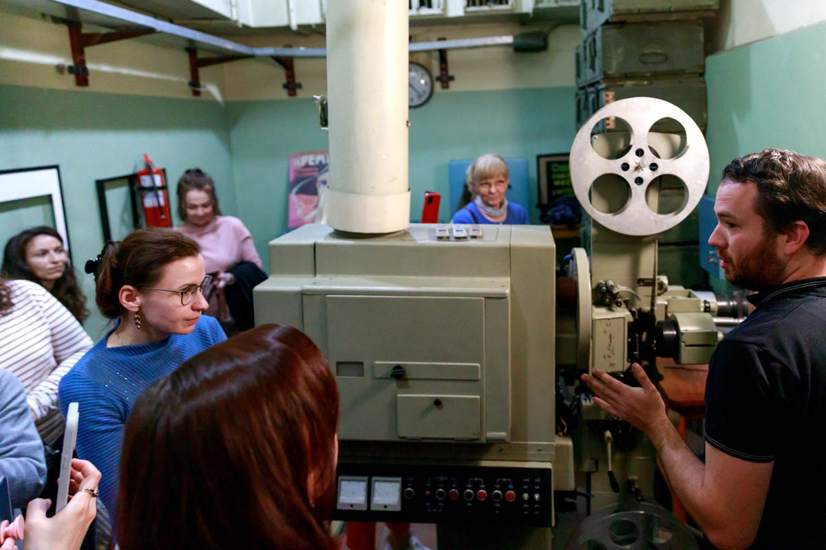 Во время экскурсии гости познакомились с типовой киноаппаратной периода 1970—1990 годов, её устройством и бытом киномеханика эпохи, когда носителем изображения и звука в кинотеатре была кинопленка 35 мм.