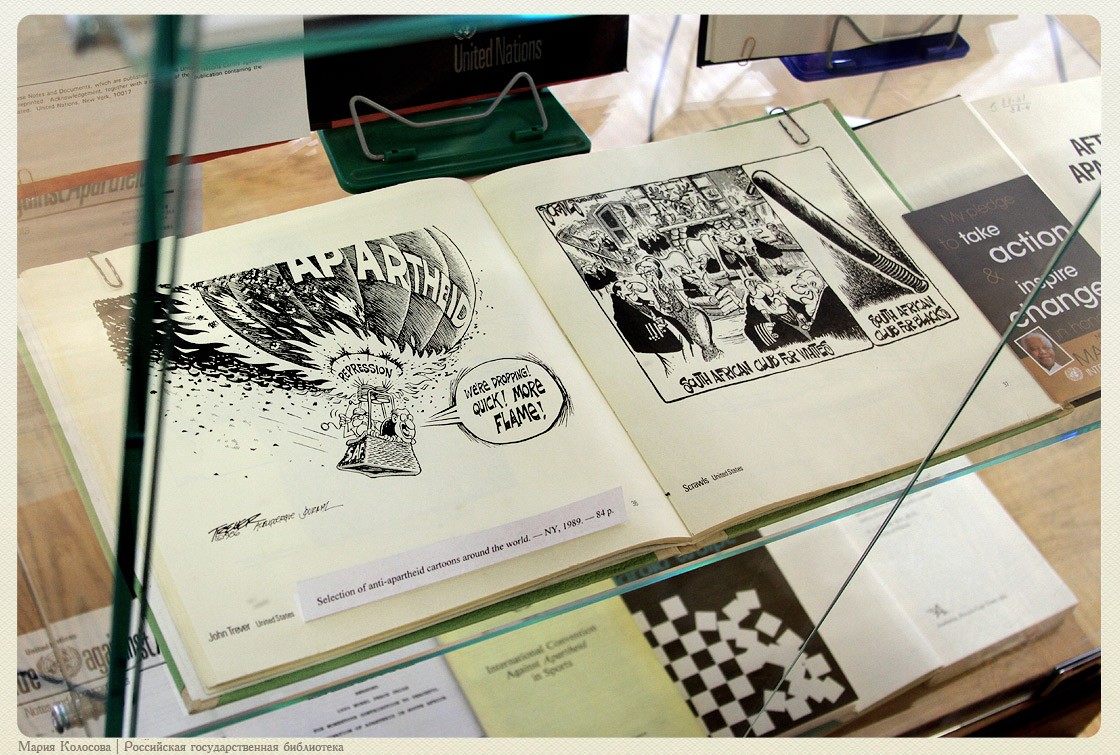 По словам старшего научного сотрудника Института Африки Российской академии наук Любови Прокопенко, по данным недавнего социологического опроса в 25 странах мира, касающегося политического лидерства, Нельсон Мандела занимает устойчивое первое место как политик с самым большим кредитом общественного доверия. В фондах РГБ хранится немало документов, имеющих отношение к личности бывшего президента ЮАР и лауреата Нобелевской премии — часть из них стала экспонатами тематической выставки, подготовленной к круглому столу: книги и альбомы о самом Манделе, его статьи и выступления. В основу выставки легли документы и публикации из депозитарного фонда ООН отдела ОФН и отдела хранения основных фондов РГБ. Весьма интересны два плаката, созданные в