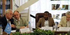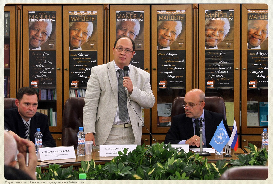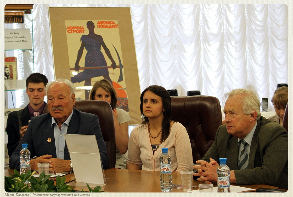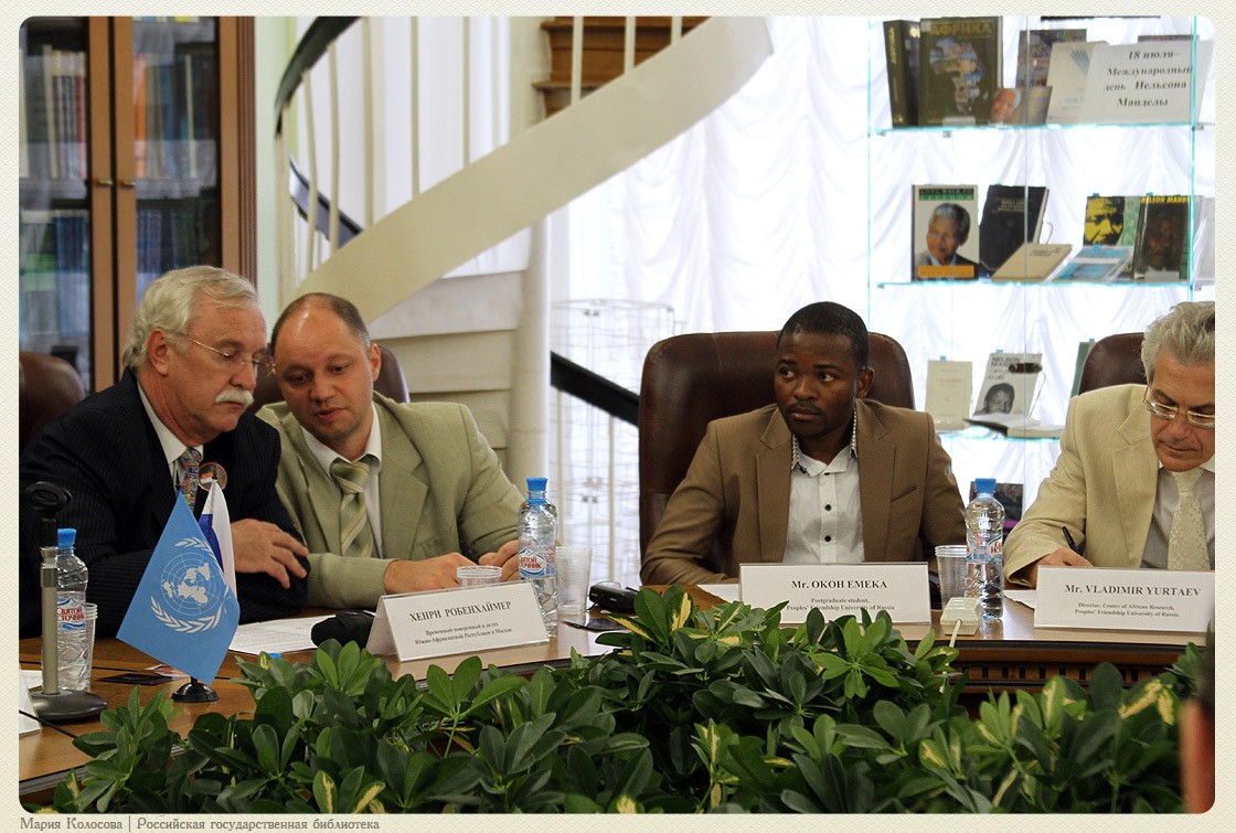 В центре документов международных организаций отдела официальных и нормативных изданий РГБ прошел круглый стол, посвященный Международному дню Нельсона Манделы. В такой форме с 2009 г. мир празднует по инициативе ООН день рождения знаменитого южноафриканского правозащитника. В основе празднования — гуманитарная акция: людей во всем мире призывают в этот день посвятить несколько минут благотворительной и социальной работе. В формате круглого стола в РГБ собрались представители посольства ЮАР, работники ООН, эксперты — африканисты, представители Министерства иностранных дел России и СССР, имеющие опыт личных встреч с Нельсоном Манделой.