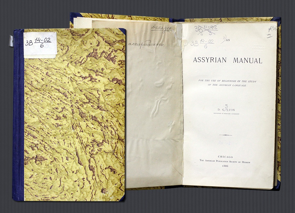 На выставке можно увидеть учебник ассирийского языка (An Assyrian Manual / by the D. G. Lyon. — Chicago, 1886). Шифр хранения ЦВЛ РГБ: ЗВ 14-02/6.