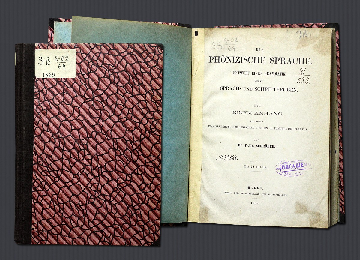 Представлена также грамматика финикийского языка (Die Phönizische Schprache: Entwurf einer Grammatik nebst Schprach- und Schriftproben / Paul Schröder. — Halle, 1869). Шифр хранения ЦВЛ РГБ: ЗВ 8-02/64.
