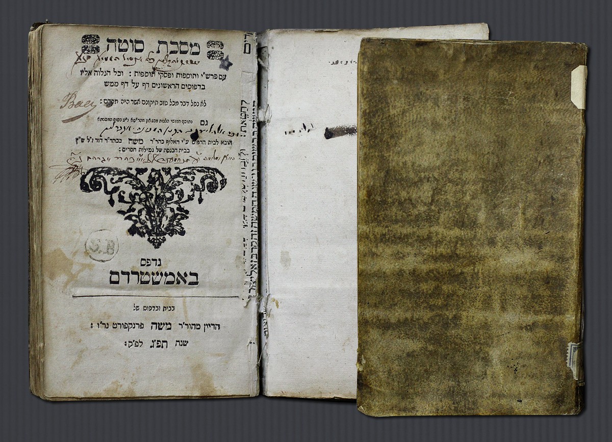 Вавилонский талмуд с комментариями. Трактат Сота. Амстердам: типография Моше Франкфурта, 1723). Коллекция Гинцбурга. Комментарии: Раши (Шломо Ицхаки, 1040–1105), Тосафот (сводный труд французских комментаторов XII–XIII веков), Пискей Тосафот (Ашер бен Йехиэль, 1250–1327), Хидушей Махарша (Шмуэль Элиэзер Эйдельс, 1555–1631). Шифр хранения ЦВЛ РГБ: Гинц-1/5177.