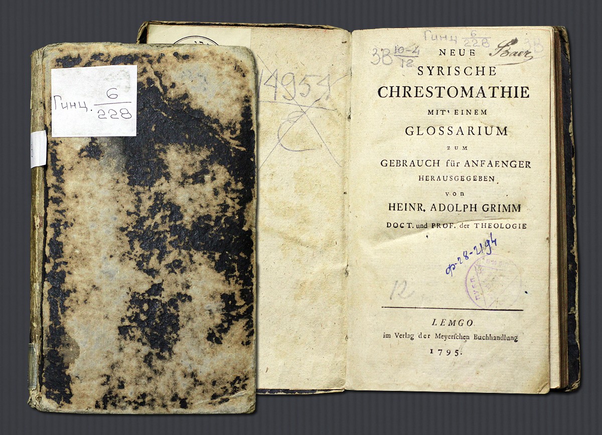 Также можно увидеть грамматику новосирийского языка (Neue Syrische Chrestomathie mit Einem Glossarium / A. Grimm. Lemgo im Verlag der Meyerschen Buchhandlung, 1795). Шифр хранения ЦВЛ РГБ: Гинц 6/228.