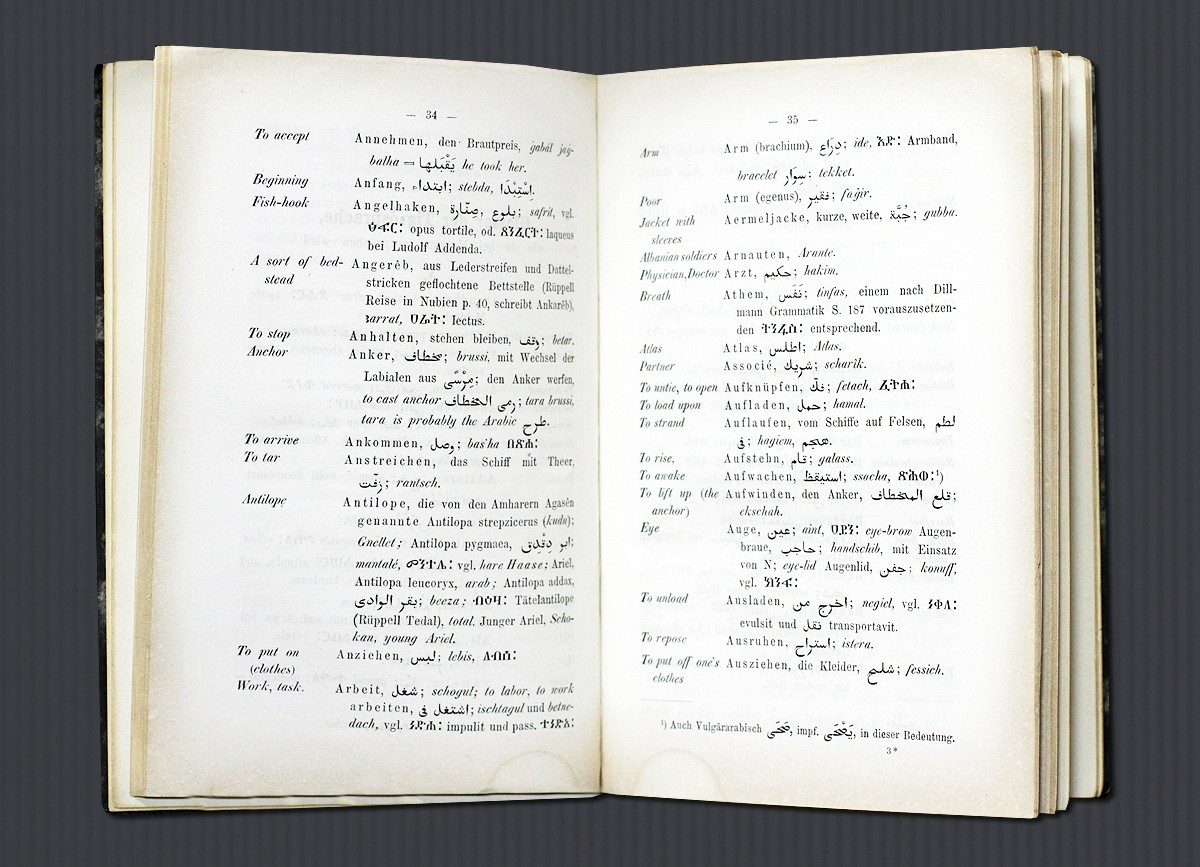 Также на выставке можно увидеть словарь языка тигре — Vocabulary of the tigré language / by M. von Beurmann, A. Merx. — London, 1868. Шифр хранения ЦВЛ РГБ: ЗВ 14-01/2.