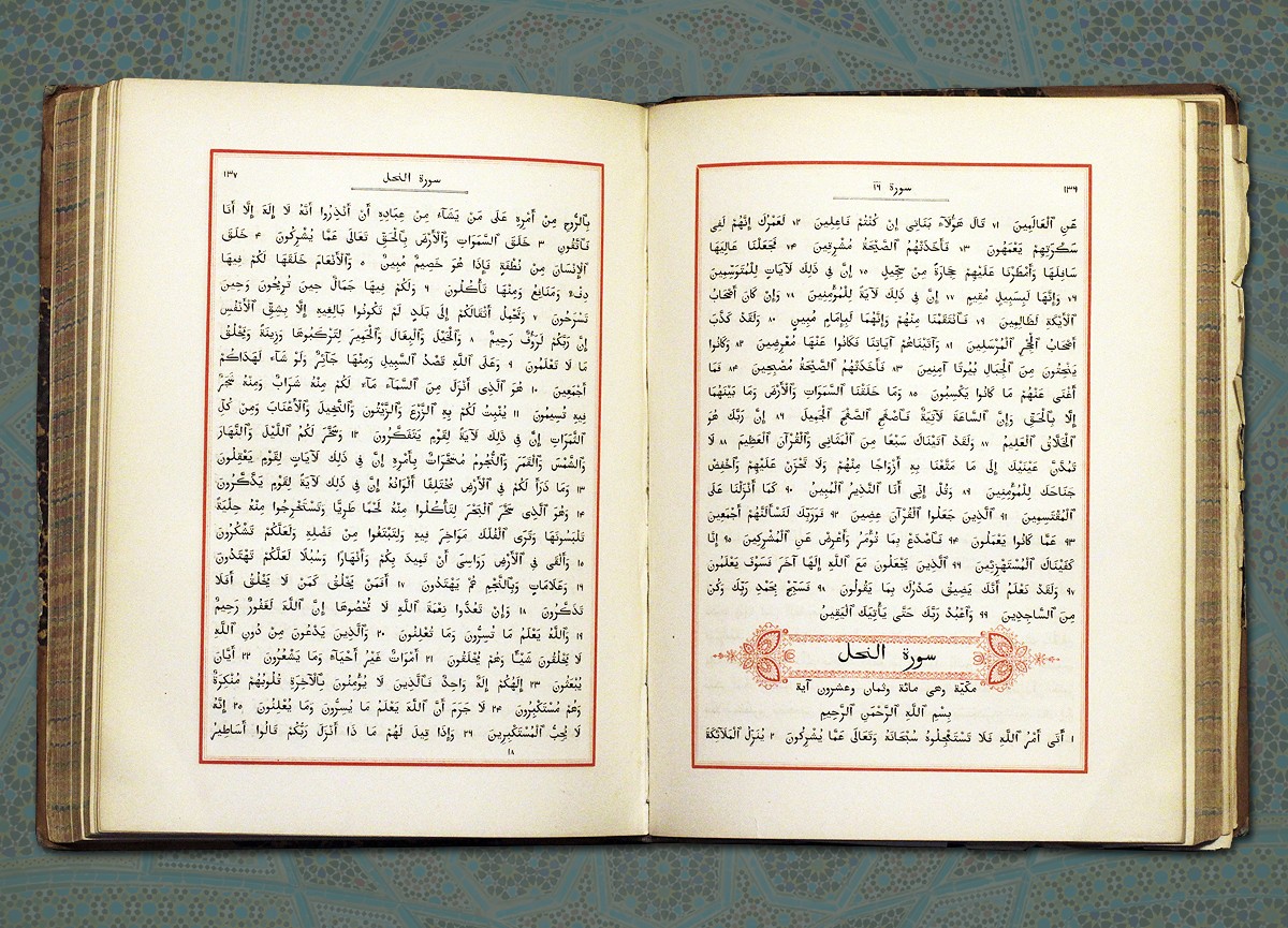 Научное издание Корана, вышедшее в Лейпциге в 1869 году, из коллекции востоковеда барона Давида Горациевича Гинцбурга (1857—1910), которое сопровождается вступительной статьёй, комментариями и пояснениями немецкого востоковеда-арабиста Густава Леберехта Флюгеля (1802—1870).