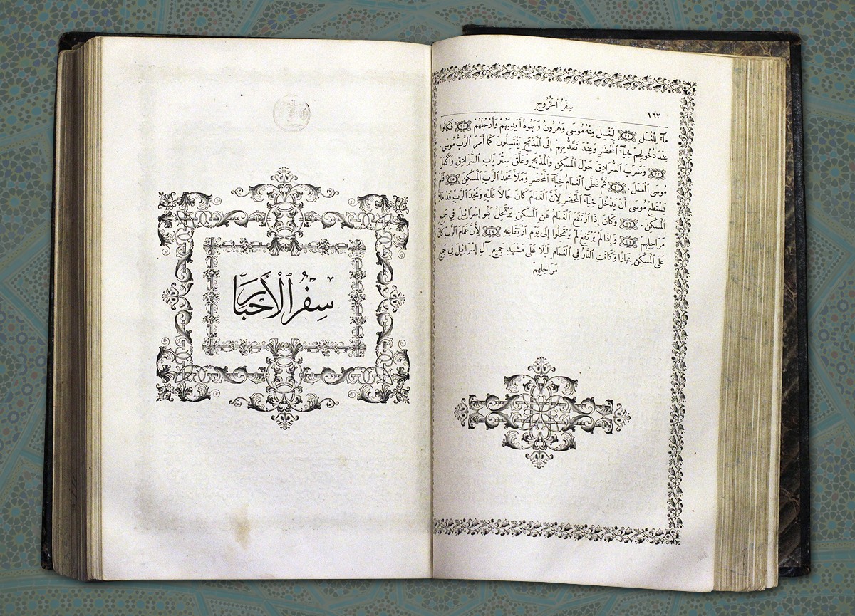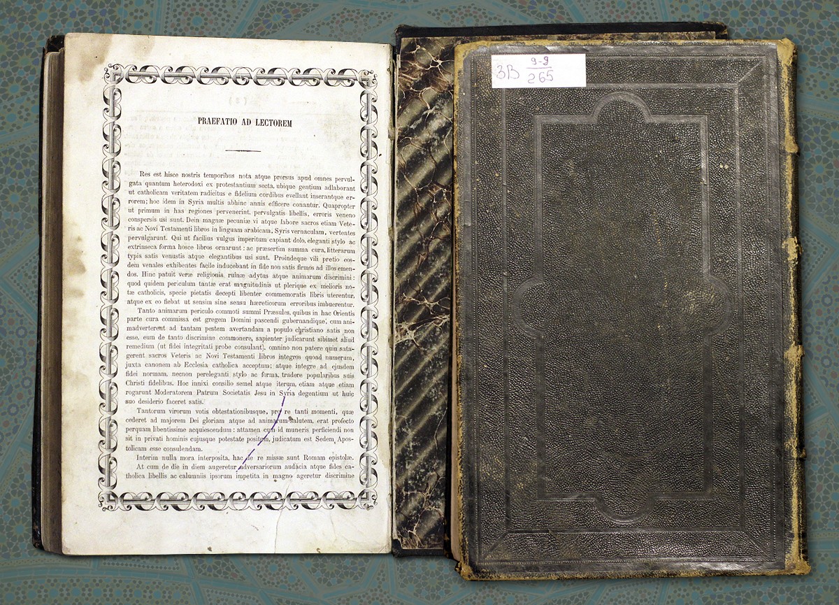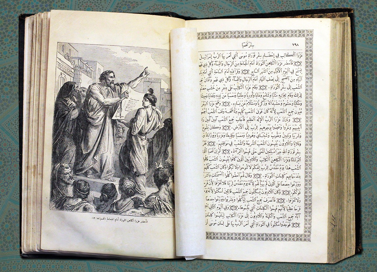 Ветхий Завет на арабском языке, изданный миссией иезуитов в Бейруте (Ливан) в 1879 году. Текст Ветхого Завета проиллюстрирован гравюрами европейских художников, среди которых гравюры французского художника XIX века Анри Феликса Филиппото.