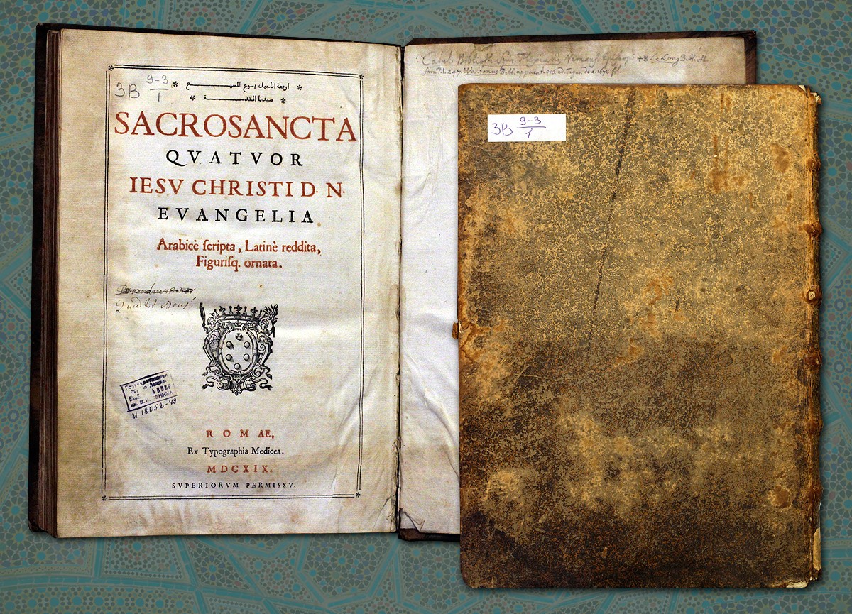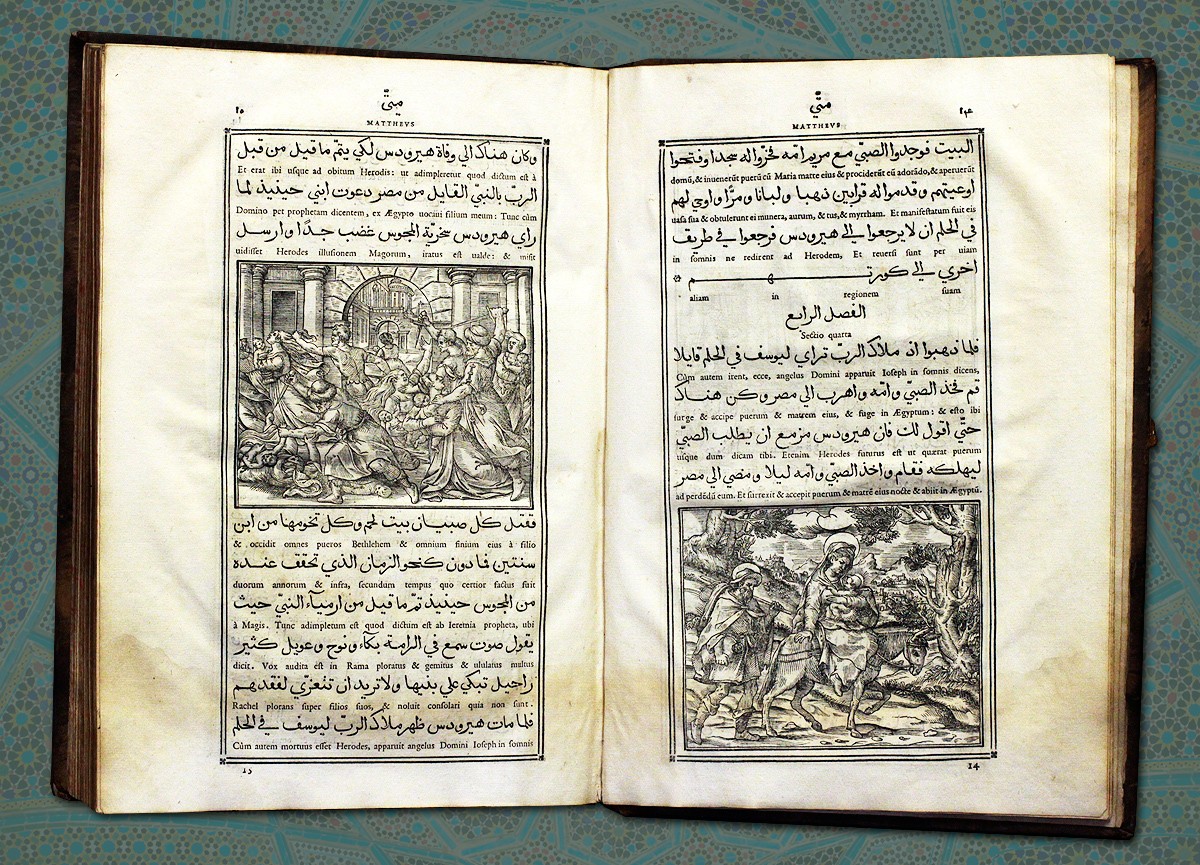Содержит четыре канонических Евангелия: от Матфея, Марка, Луки и Иоанна. Четвероевангелие на арабском языке с междустрочным латинским переводом, и гравюрами, поясняющими текст, изданное типографией Медичи в Риме в 1619 году. Предисловие от издателя на латыни.