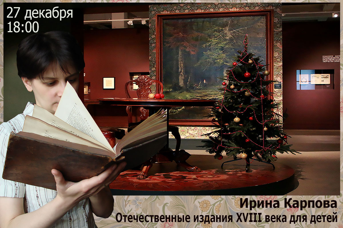 27 декабря последнюю экскурсию 2018 года в пространстве выставки «Книги старого дома: мир детства XIX — начала XX века» проведёт Ирина Карпова, работающая в Музее книги РГБ. Ирина Леонидовна расскажет о том, как зарождалась в России литература для детей, и покажет, что из книжных сокровищ XVIII века можно увидеть на выставке в Ивановском зале.