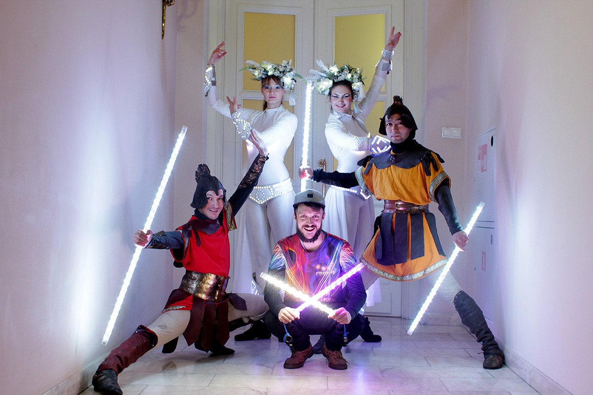 Праздник начинался еще на улице — во внутреннем дворе Дома Пашкова. Гости увидели яркое световое шоу. В окружении танцующих весталок гладиаторы разыграли театрализованный бой на мечах. В финале шоу артисты написали разноцветными лучами в воздухе имя последнего ученика школы Аристотеля, прославленного римского врача Галена.
