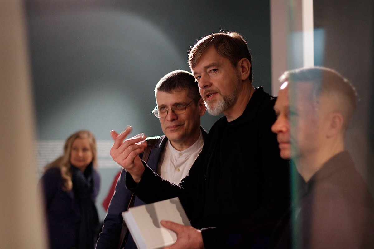 Книжный дизайнер Евгений Корнеев (посередине) на открытии выставки «Книга глазами дизайнера»