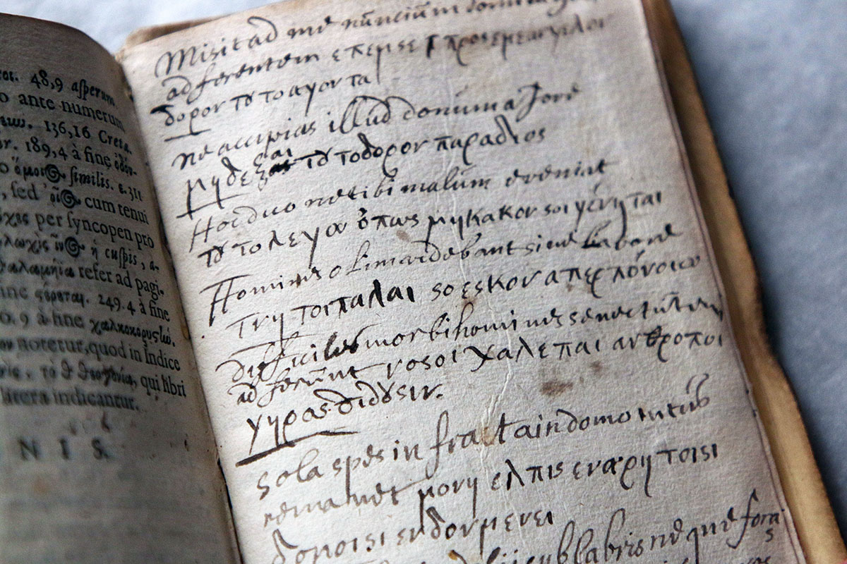 Разворот из Собрания произведений древнегреческого поэта Гесиода (VIII в. до н. э. — VII в. до н. э.) в переводе на латынь. Этот экземпляр использовался ещё и в качестве записной книжки — верхние и нижние белые приплетённые листы книги заполнены выписанными рукой Николая Борисовича Юсупова афоризмами из трудов Гесиода.