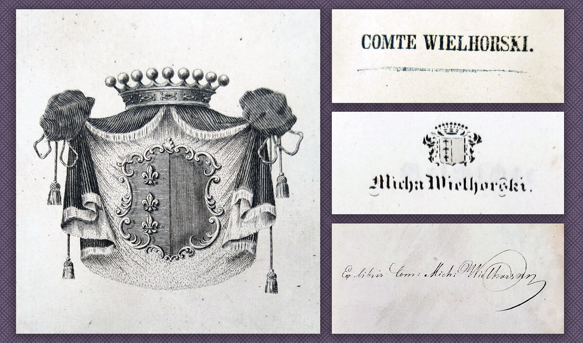 Практически все книги из коллекции графа Виельгорского имеют владельческие признаки. На большинстве книг встречается рукописная надпись Ex libris com. Mich. Wielhorskii . Также встречаются именные печати. На нескольких книгах наклеен экслибрис Юрия Михайловича, отца графа Виельгорского.