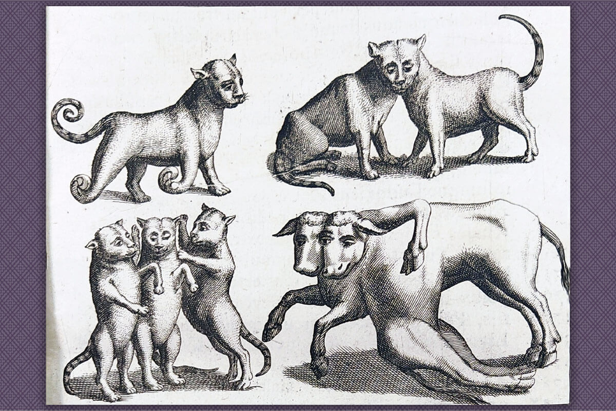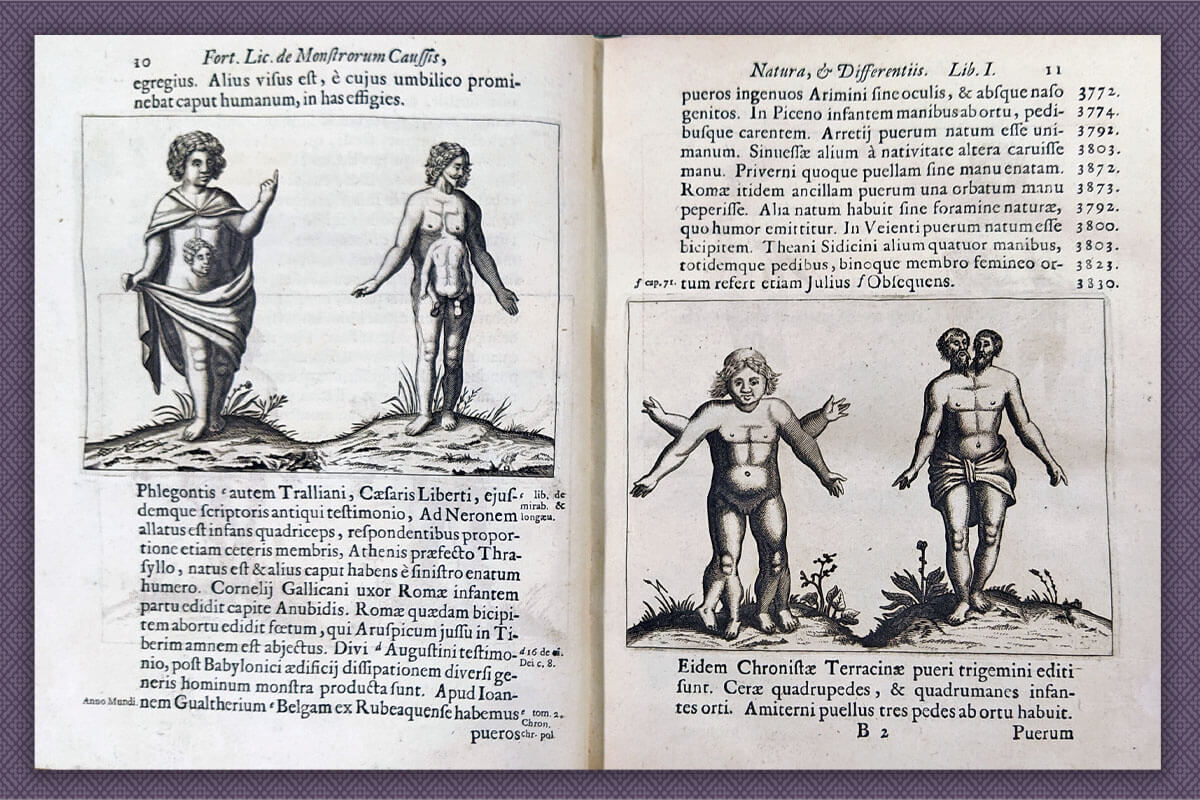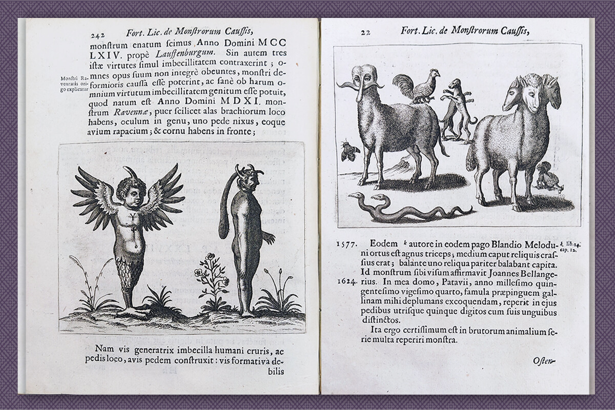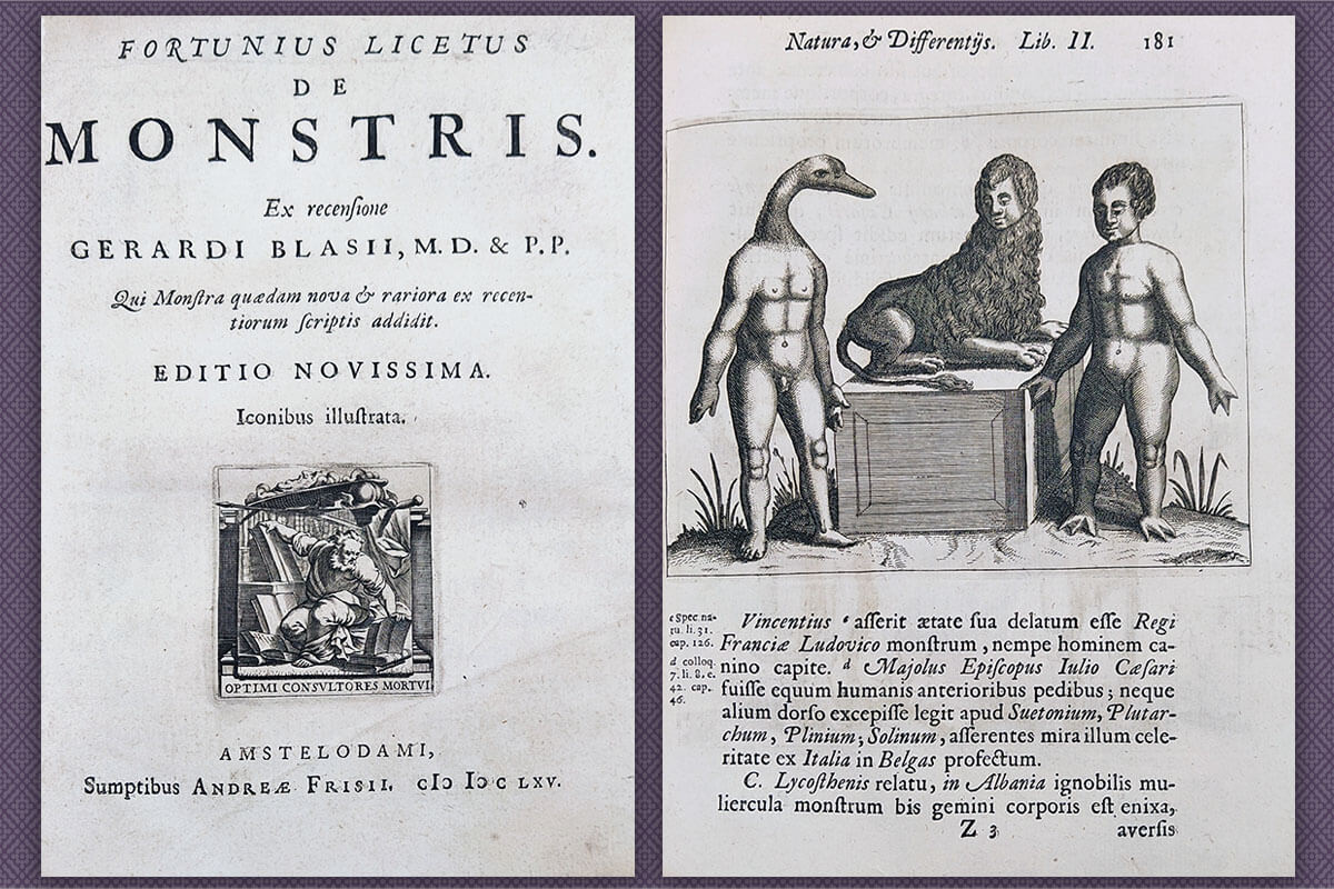 Из большой коллекции хотелось бы выделить несколько интересных книг, таких как, к примеру, книга Фортунио Лицети «Монстры» (Fortunius Licetus «De monstris») 1665 года издания. В этом труде подробно описаны и проиллюстрированы анатомические патологии людей и животных. На момент издания в Европе XVII века грань между наукой и сверхъестественным всё ещё была неточной и наряду с людьми в книге изображены мифологические монстры и волшебные уродцы.