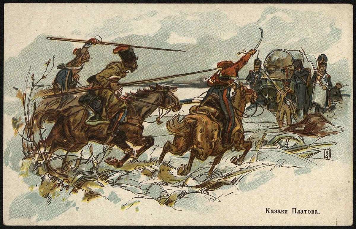 Казаки Платова : [рекламная карточка] / художник А. П. Апсит. Москва : [Б. и.], [190-]