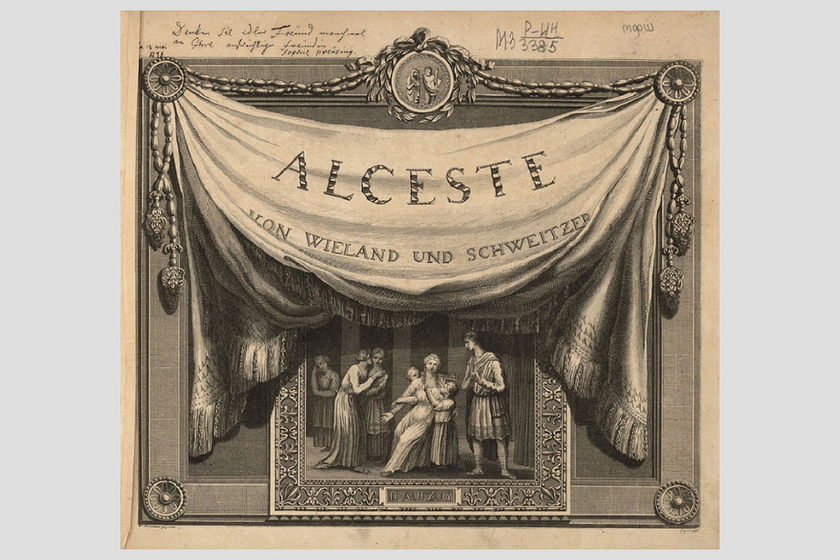 Лекция познакомит с двумя редкими операми, сохранившимися в фонде музыкального отдела. Первая из них — опера «Альцеста» (1774) Кристофа Мартина Виланда и Антона Швейцера. Библиотека царского дома, формирование которой началось с середины XVIII века, включала в себя книжные собрания всех русских императоров. Первый императорский библиотечный штамп — Bibliothèque de Tsarskoe Selo — был утверждён Александром I после 1816 года. Наличие этого гербового штампа на партитуре оперы «Альцеста» Виланда и Швейцера позволяет отнести издание к коллекции императрицы Елизаветы Алексеевны, супруги Александра I.